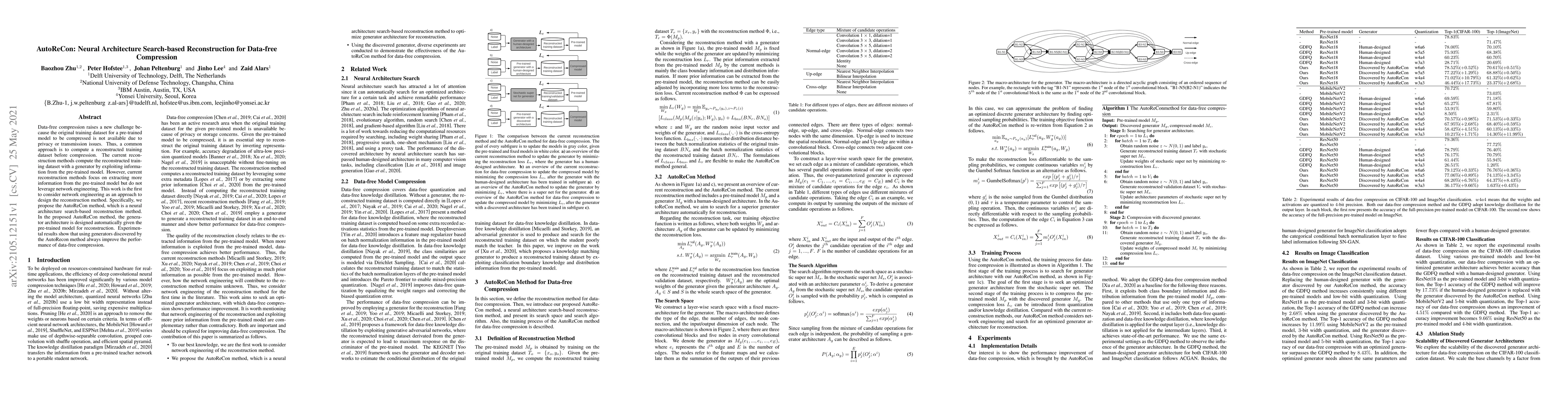 Data-free compression raises a new challenge because the original training dataset for a pre-trained model to be compressed is not available due to privacy or transmission issues. Thus, a common approach is to compute a reconstructed training dataset before compression. The current reconstruction methods compute the reconstructed training dataset with a generator by exploiting information from the pre-trained model. However, current reconstruction methods focus on extracting more information from the pre-trained model but do not leverage network engineering. This work is the first to consider network engineering as an approach to design the reconstruction method. Specifically, we propose the AutoReCon method, which is a neural architecture search-based reconstruction method. In the proposed AutoReCon method, the generator architecture is designed automatically given the pre-trained model for reconstruction. Experimental results show that using generators discovered by the AutoRecon method always improve the performance of data-free compression.