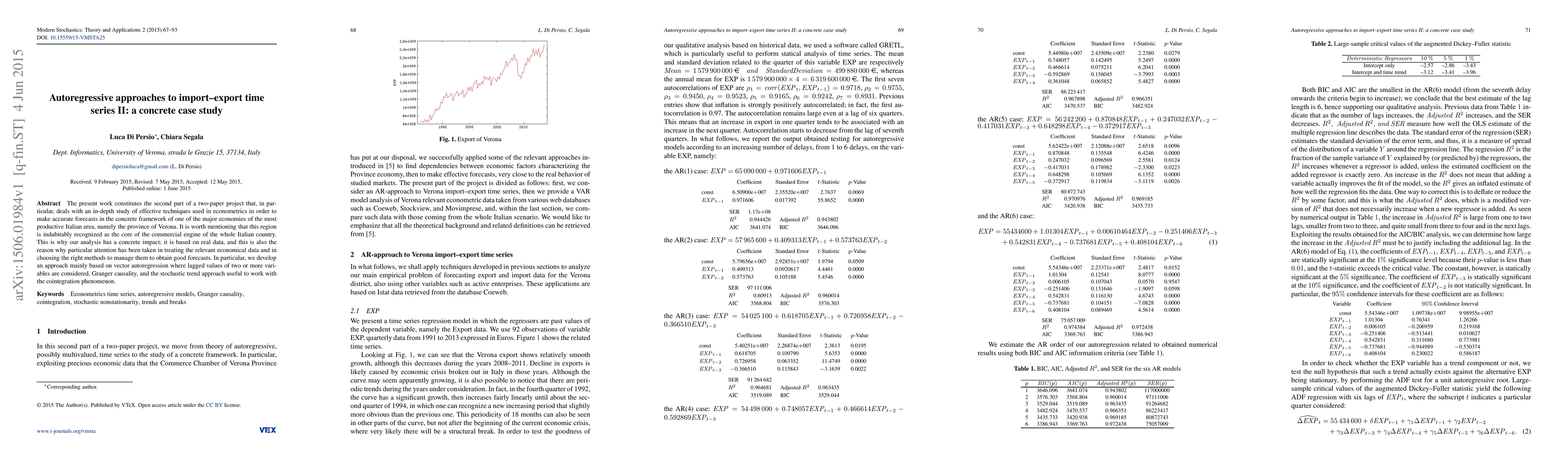This paper explores autoregressive techniques, particularly vector autoregression, Granger causality, and stochastic trends, to forecast import-export time series data for the economically significant province of Verona in Italy, emphasizing the practical impact of accurate economic forecasting. The study focuses on real data and rigorous econometric methods to achieve reliable predictions.