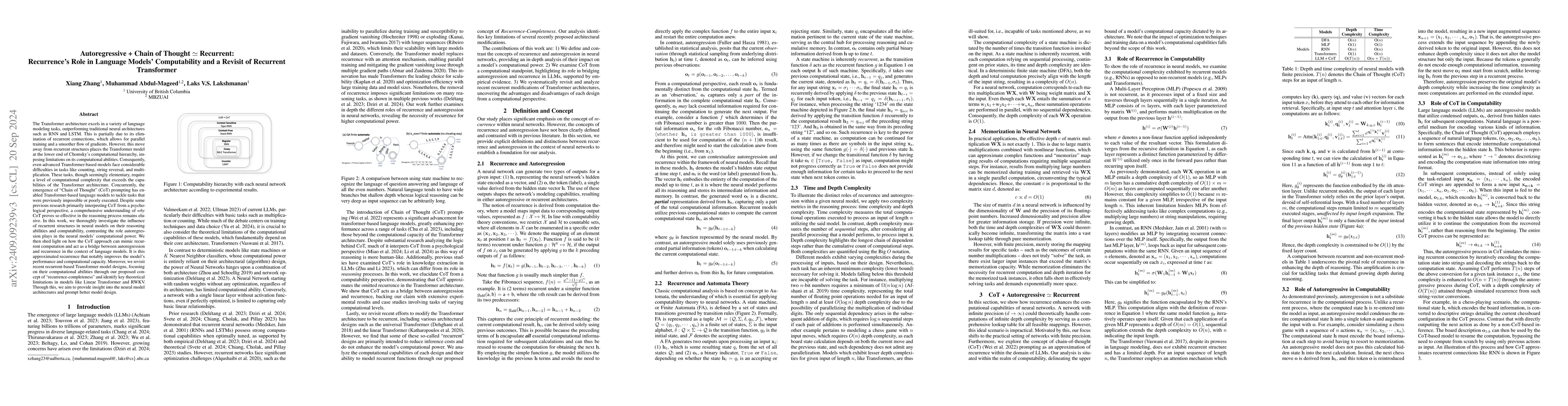 The Transformer architecture excels in a variety of language modeling tasks, outperforming traditional neural architectures such as RNN and LSTM. This is partially due to its elimination of recurrent connections, which allows for parallel training and a smoother flow of gradients. However, this move away from recurrent structures places the Transformer model at the lower end of Chomsky's computational hierarchy, imposing limitations on its computational abilities. Consequently, even advanced Transformer-based models face considerable difficulties in tasks like counting, string reversal, bracket pairing, and multiplication. These tasks, though seemingly elementary, require a level of computational complexity that exceeds the capabilities of the Transformer architecture. Concurrently, the emergence of ``Chain of Thought" (CoT) prompting has enabled Transformer-based language models to tackle tasks that were previously impossible or poorly executed. Despite some previous research primarily interpreting CoT from a psychological perspective, a comprehensive understanding of \textit{why} CoT proves so effective in the reasoning process remains elusive. In this work, we thoroughly investigate the influence of recurrent structures in language models on their reasoning abilities, shedding light on how the CoT approach can mimic recurrent computation and act as a bridge between autoregression and recurrence. It is this approximated recurrence that notably improves the model's performance and computational capacity. Moreover, we revisit recent recurrent-based Transformer model designs, focusing on their computational abilities through our proposed concept of ``recurrence-completeness" and identify key theoretical limitations in models like Linear Transformer and RWKV. Through this, we aim to provide insight into the neural model architectures and prompt better model design.