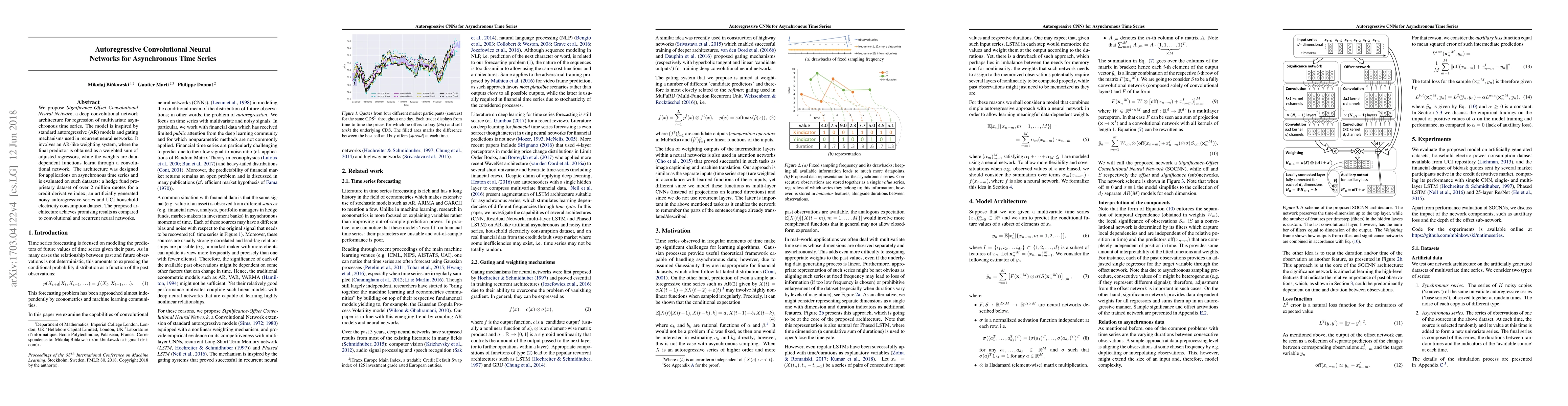 We propose Significance-Offset Convolutional Neural Network, a deep convolutional network architecture for regression of multivariate asynchronous time series. The model is inspired by standard autoregressive (AR) models and gating mechanisms used in recurrent neural networks. It involves an AR-like weighting system, where the final predictor is obtained as a weighted sum of adjusted regressors, while the weights are datadependent functions learnt through a convolutional network. The architecture was designed for applications on asynchronous time series and is evaluated on such datasets: a hedge fund proprietary dataset of over 2 million quotes for a credit derivative index, an artificially generated noisy autoregressive series and UCI household electricity consumption dataset. The proposed architecture achieves promising results as compared to convolutional and recurrent neural networks.