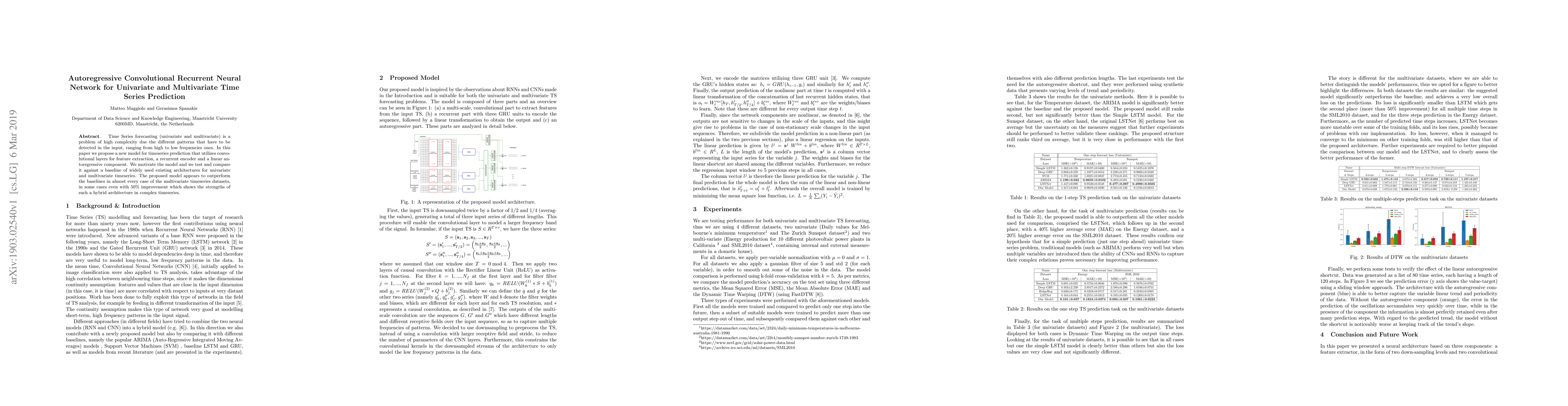 This paper proposes an Autoregressive Convolutional Recurrent Neural Network (AR-CRNN) for time series prediction, combining convolutional layers for feature extraction, a recurrent encoder, and an autoregressive component. The model outperforms existing baselines, especially in multivariate time series datasets, showing significant improvements in some cases.