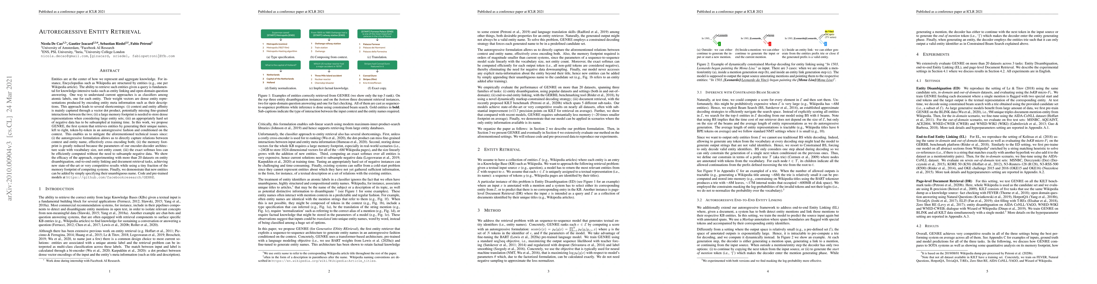 Entities are at the center of how we represent and aggregate knowledge. For instance, Encyclopedias such as Wikipedia are structured by entities (e.g., one per Wikipedia article). The ability to retrieve such entities given a query is fundamental for knowledge-intensive tasks such as entity linking and open-domain question answering. Current approaches can be understood as classifiers among atomic labels, one for each entity. Their weight vectors are dense entity representations produced by encoding entity meta information such as their descriptions. This approach has several shortcomings: (i) context and entity affinity is mainly captured through a vector dot product, potentially missing fine-grained interactions; (ii) a large memory footprint is needed to store dense representations when considering large entity sets; (iii) an appropriately hard set of negative data has to be subsampled at training time. In this work, we propose GENRE, the first system that retrieves entities by generating their unique names, left to right, token-by-token in an autoregressive fashion. This mitigates the aforementioned technical issues since: (i) the autoregressive formulation directly captures relations between context and entity name, effectively cross encoding both; (ii) the memory footprint is greatly reduced because the parameters of our encoder-decoder architecture scale with vocabulary size, not entity count; (iii) the softmax loss is computed without subsampling negative data. We experiment with more than 20 datasets on entity disambiguation, end-to-end entity linking and document retrieval tasks, achieving new state-of-the-art or very competitive results while using a tiny fraction of the memory footprint of competing systems. Finally, we demonstrate that new entities can be added by simply specifying their names. Code and pre-trained models at https://github.com/facebookresearch/GENRE.