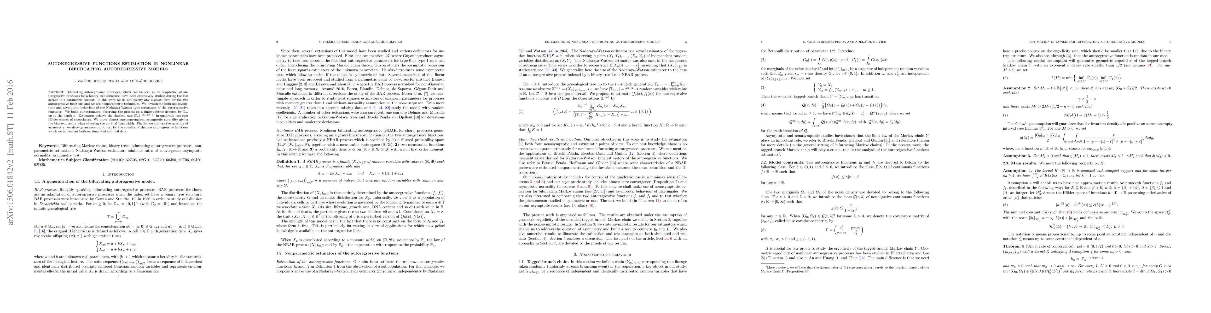 This paper explores nonparametric estimation of autoregressive functions in bifurcating autoregressive models using Nadaraya-Watson type estimators. It demonstrates almost sure convergence, asymptotic normality, and optimal bandwidth selection, achieving the classical rate in quadratic loss over Hölder classes.