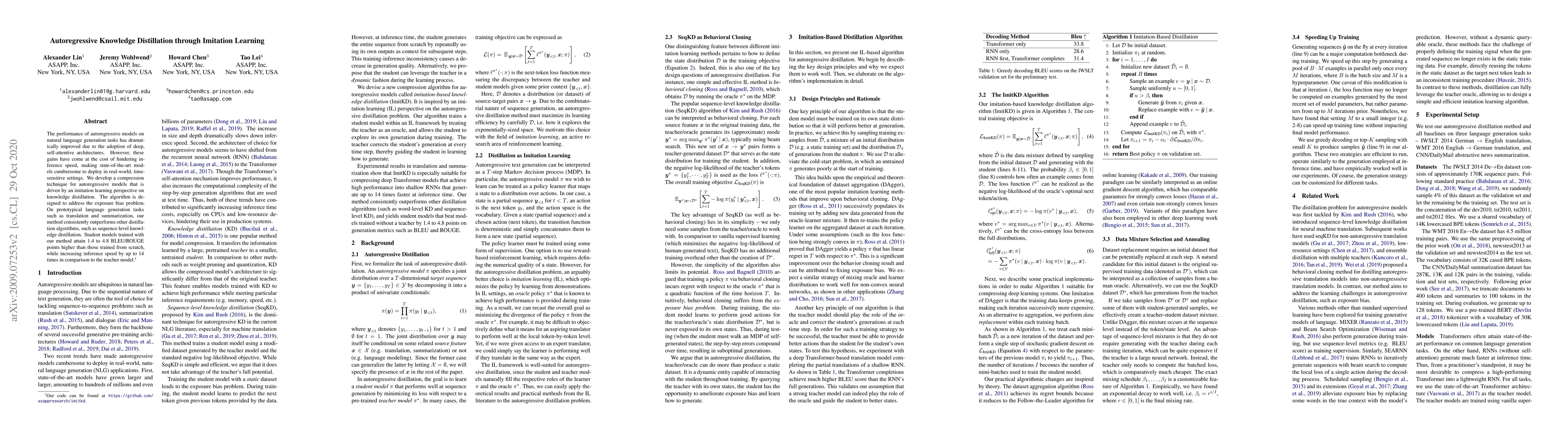 This paper proposes an autoregressive knowledge distillation technique using imitation learning to improve inference speed and performance of natural language generation models. The method effectively addresses exposure bias and outperforms other distillation techniques, achieving higher BLEU/ROUGE scores and up to 14 times faster inference speeds.