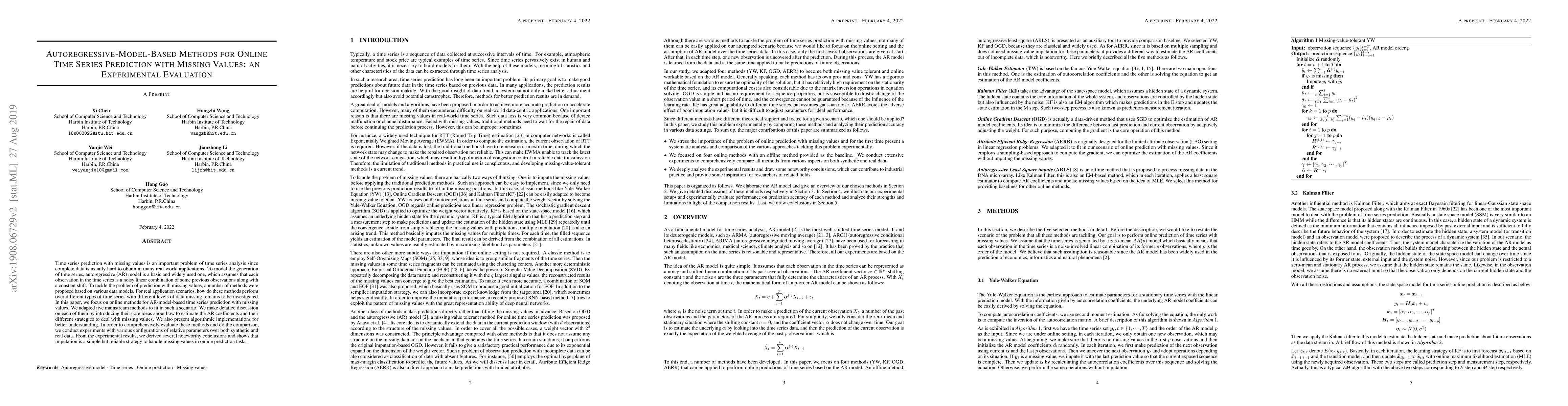 This paper evaluates autoregressive-model-based methods for online time series prediction with missing values, adapting five mainstream techniques and comparing their performance on both synthetic and real datasets. The study concludes that imputation is a reliable strategy for handling missing data in online prediction tasks.