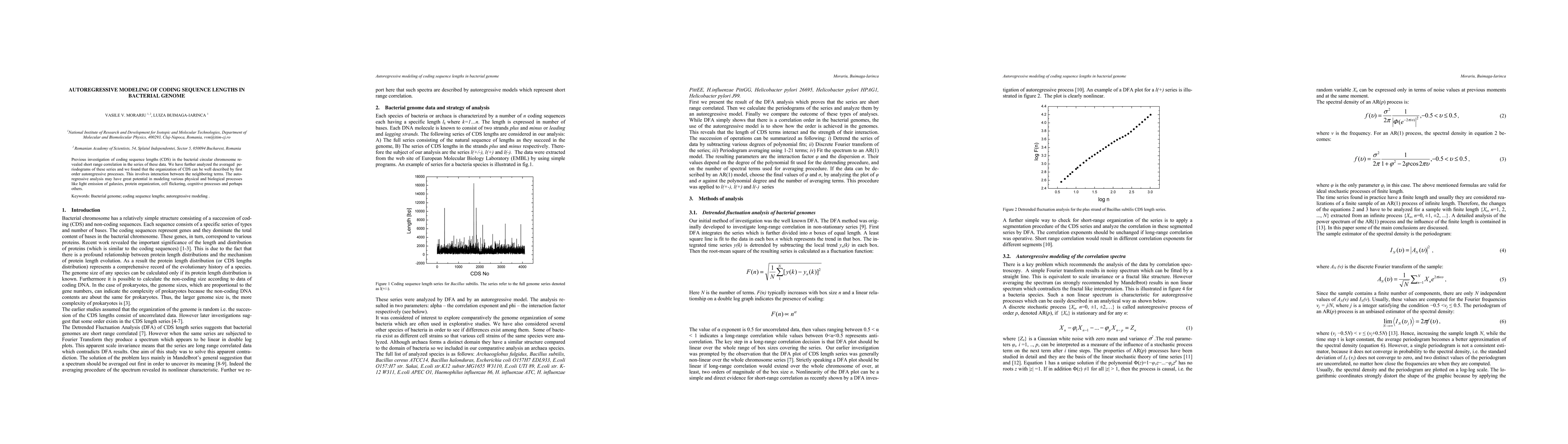 Previous investigation of coding sequence lengths (CDS) in the bacterial circular chromosome revealed short range correlation in the series of these data. We have further analyzed the averaged periodograms of these series and we found that the organization of CDS can be well described by first order autoregressive processes. This involves interaction between the neighboring terms. The autoregressive analysis may have great potential in modeling various physical and biological processes like light emission of galaxies, protein organization, cell flickering, cognitive processes and perhaps others.