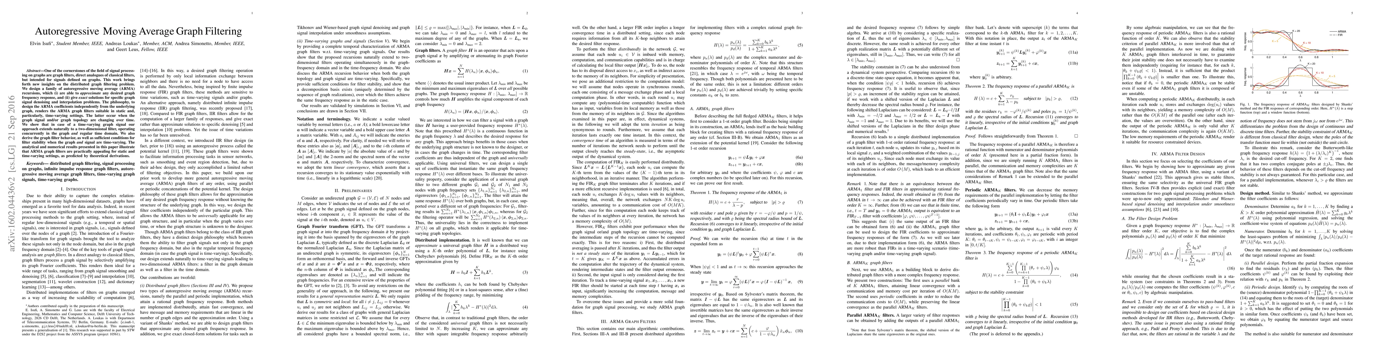 This paper introduces autoregressive moving average (ARMA) graph filters for signal processing on graphs, capable of approximating any desired frequency response and providing exact solutions for denoising and interpolation. The designed filters are stable and applicable to both static and time-varying graph signals, with analytical and numerical results supporting their practical effectiveness.