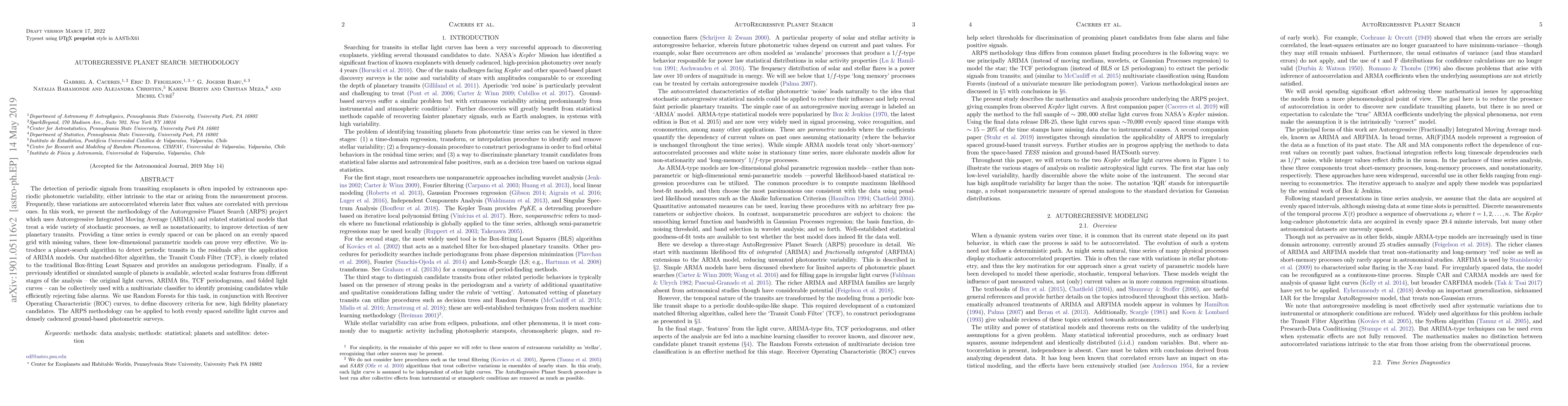 The detection of periodic signals from transiting exoplanets is often impeded by extraneous aperiodic photometric variability, either intrinsic to the star or arising from the measurement process. Frequently, these variations are autocorrelated wherein later flux values are correlated with previous ones. In this work, we present the methodology of the Autoregessive Planet Search (ARPS) project which uses Autoregressive Integrated Moving Average (ARIMA) and related statistical models that treat a wide variety of stochastic processes, as well as nonstationarity, to improve detection of new planetary transits. Providing a time series is evenly spaced or can be placed on an evenly spaced grid with missing values, these low-dimensional parametric models can prove very effective. We introduce a planet-search algorithm to detect periodic transits in the residuals after the application of ARIMA models. Our matched-filter algorithm, the Transit Comb Filter (TCF), is closely related to the traditional Box-fitting Least Squares and provides an analogous periodogram. Finally, if a previously identified or simulated sample of planets is available, selected scalar features from different stages of the analysis -- the original light curves, ARIMA fits, TCF periodograms, and folded light curves -- can be collectively used with a multivariate classifier to identify promising candidates while efficiently rejecting false alarms. We use Random Forests for this task, in conjunction with Receiver Operating Characteristic (ROC) curves, to define discovery criteria for new, high fidelity planetary candidates. The ARPS methodology can be applied to both evenly spaced satellite light curves and densely cadenced ground-based photometric surveys.