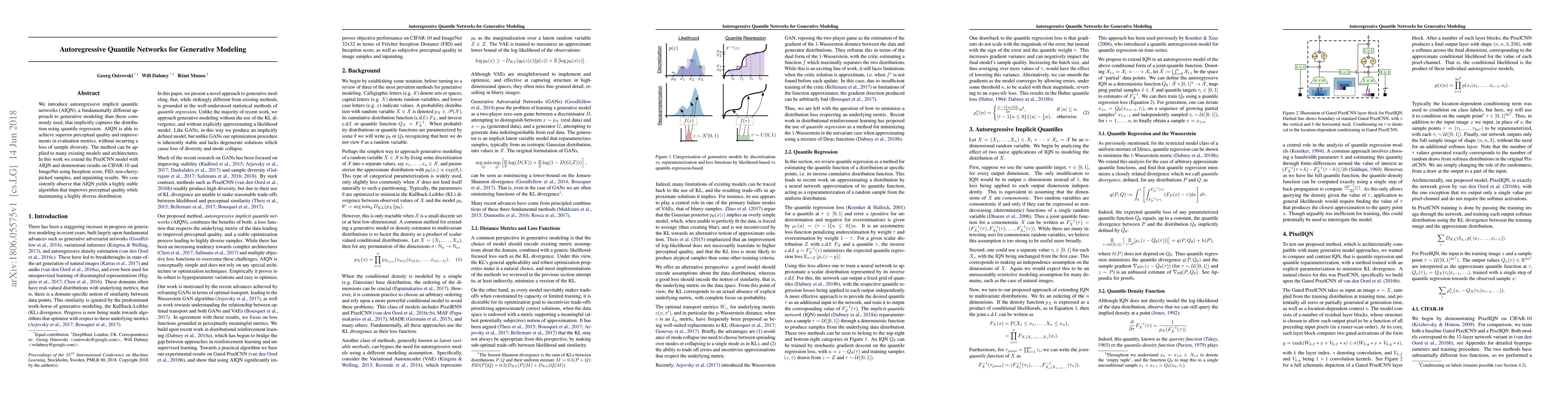 Autoregressive implicit quantile networks (AIQN) offer a novel approach to generative modeling through quantile regression, achieving superior perceptual quality and diverse samples. When applied to PixelCNN, AIQN enhances results on CIFAR-10 and ImageNet, demonstrating stable performance and improved evaluation metrics.