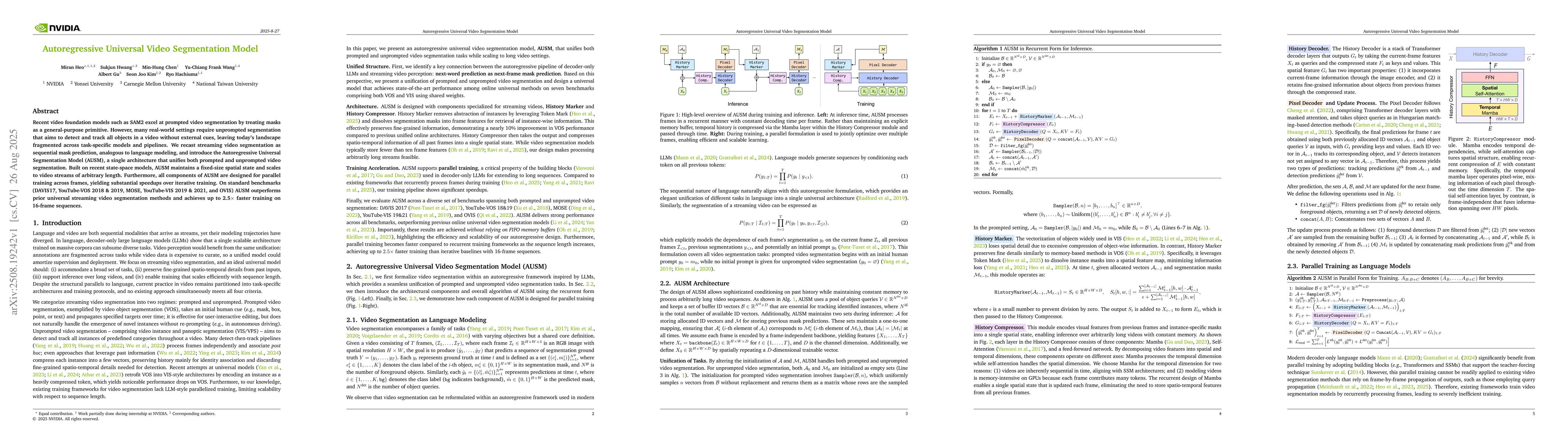 Recent video foundation models such as SAM2 excel at prompted video segmentation by treating masks as a general-purpose primitive. However, many real-world settings require unprompted segmentation that aims to detect and track all objects in a video without external cues, leaving today's landscape fragmented across task-specific models and pipelines. We recast streaming video segmentation as sequential mask prediction, analogous to language modeling, and introduce the Autoregressive Universal Segmentation Model (AUSM), a single architecture that unifies both prompted and unprompted video segmentation. Built on recent state-space models, AUSM maintains a fixed-size spatial state and scales to video streams of arbitrary length. Furthermore, all components of AUSM are designed for parallel training across frames, yielding substantial speedups over iterative training. On standard benchmarks (DAVIS17, YouTube-VOS 2018 & 2019, MOSE, YouTube-VIS 2019 & 2021, and OVIS) AUSM outperforms prior universal streaming video segmentation methods and achieves up to 2.5x faster training on 16-frame sequences.