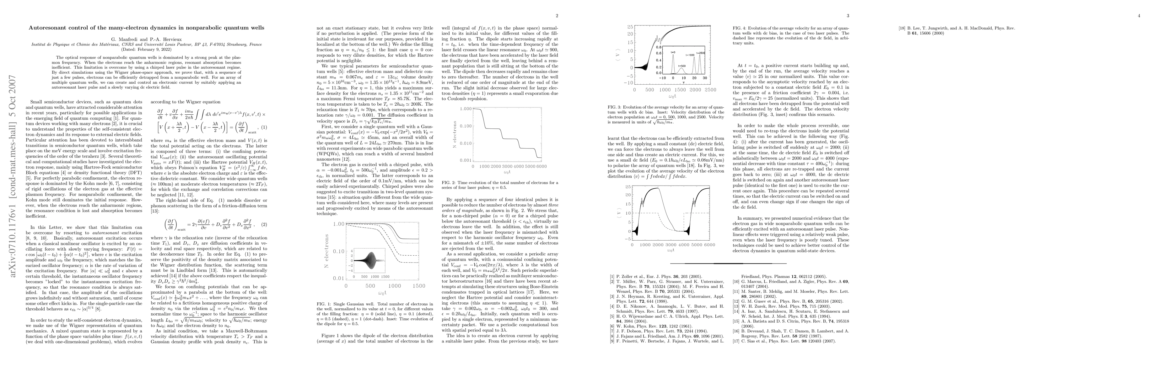 The optical response of nonparabolic quantum wells is dominated by a strong peak at the plasmon frequency. When the electrons reach the anharmonic regions, resonant absorption becomes inefficient. This limitation is overcome by using a chirped laser pulse in the autoresonant regime. By direct simulations using the Wigner phase-space approach, the authors prove that, with a sequence of just a few pulses, electrons can be efficiently detrapped from a nonparabolic well. For an array of multiple quantum wells, they can create and control an electronic current by suitably applying an autoresonant laser pulse and a slowly varying dc electric field.