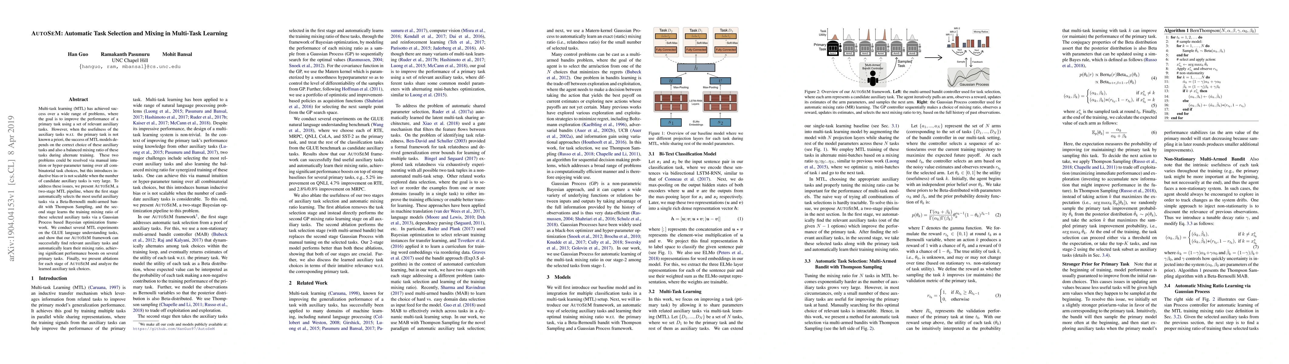 Multi-task learning (MTL) has achieved success over a wide range of problems, where the goal is to improve the performance of a primary task using a set of relevant auxiliary tasks. However, when the usefulness of the auxiliary tasks w.r.t. the primary task is not known a priori, the success of MTL models depends on the correct choice of these auxiliary tasks and also a balanced mixing ratio of these tasks during alternate training. These two problems could be resolved via manual intuition or hyper-parameter tuning over all combinatorial task choices, but this introduces inductive bias or is not scalable when the number of candidate auxiliary tasks is very large. To address these issues, we present AutoSeM, a two-stage MTL pipeline, where the first stage automatically selects the most useful auxiliary tasks via a Beta-Bernoulli multi-armed bandit with Thompson Sampling, and the second stage learns the training mixing ratio of these selected auxiliary tasks via a Gaussian Process based Bayesian optimization framework. We conduct several MTL experiments on the GLUE language understanding tasks, and show that our AutoSeM framework can successfully find relevant auxiliary tasks and automatically learn their mixing ratio, achieving significant performance boosts on several primary tasks. Finally, we present ablations for each stage of AutoSeM and analyze the learned auxiliary task choices.