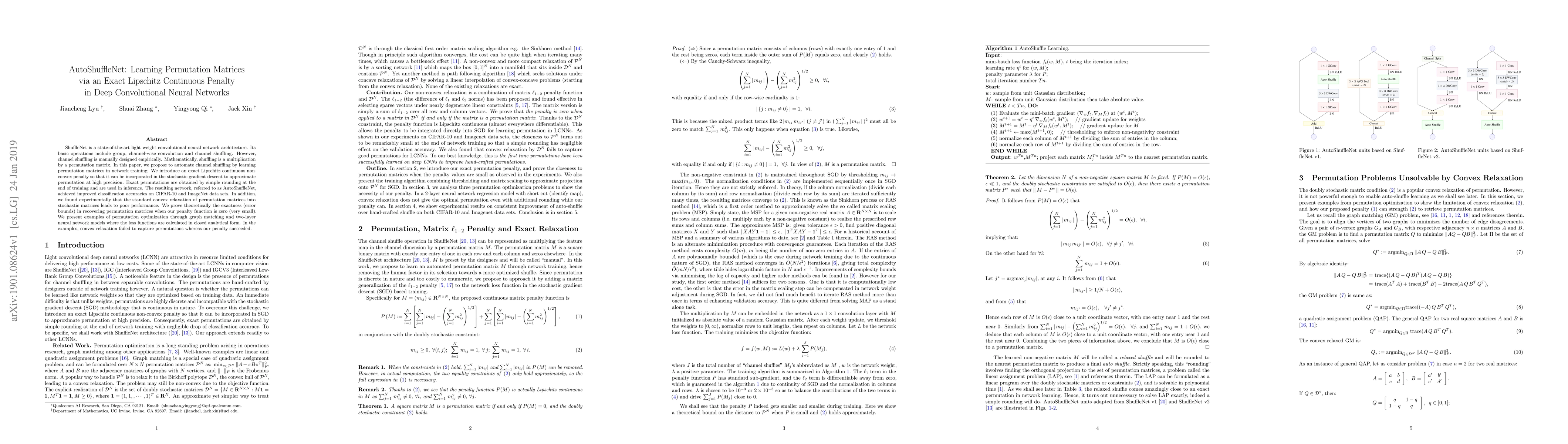 ShuffleNet is a state-of-the-art light weight convolutional neural network architecture. Its basic operations include group, channel-wise convolution and channel shuffling. However, channel shuffling is manually designed empirically. Mathematically, shuffling is a multiplication by a permutation matrix. In this paper, we propose to automate channel shuffling by learning permutation matrices in network training. We introduce an exact Lipschitz continuous non-convex penalty so that it can be incorporated in the stochastic gradient descent to approximate permutation at high precision. Exact permutations are obtained by simple rounding at the end of training and are used in inference. The resulting network, referred to as AutoShuffleNet, achieved improved classification accuracies on CIFAR-10 and ImageNet data sets. In addition, we found experimentally that the standard convex relaxation of permutation matrices into stochastic matrices leads to poor performance. We prove theoretically the exactness (error bounds) in recovering permutation matrices when our penalty function is zero (very small). We present examples of permutation optimization through graph matching and two-layer neural network models where the loss functions are calculated in closed analytical form. In the examples, convex relaxation failed to capture permutations whereas our penalty succeeded.