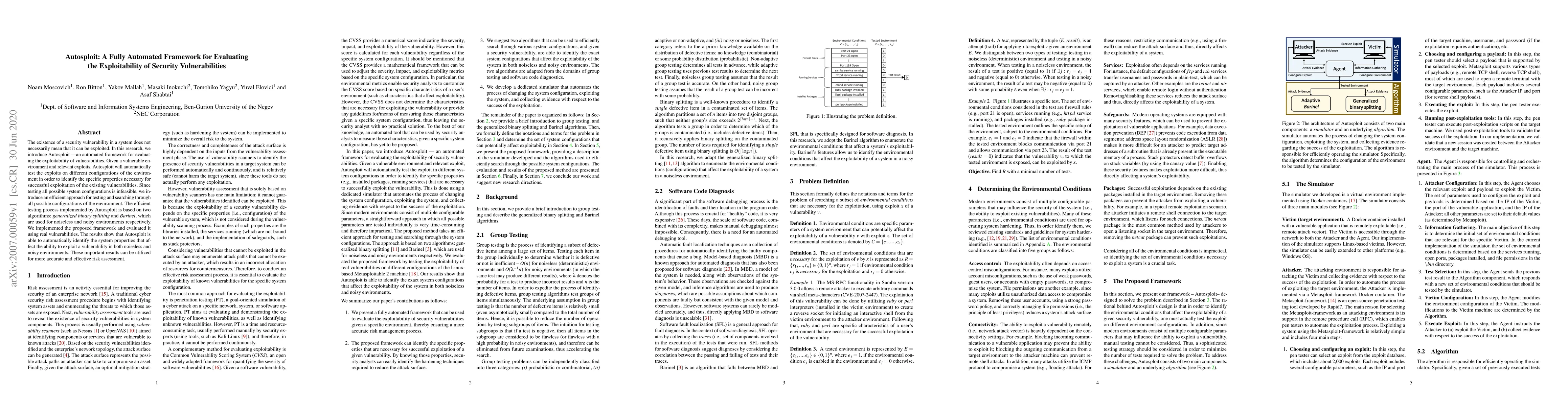 The existence of a security vulnerability in a system does not necessarily mean that it can be exploited. In this research, we introduce Autosploit -- an automated framework for evaluating the exploitability of vulnerabilities. Given a vulnerable environment and relevant exploits, Autosploit will automatically test the exploits on different configurations of the environment in order to identify the specific properties necessary for successful exploitation of the existing vulnerabilities. Since testing all possible system configurations is infeasible, we introduce an efficient approach for testing and searching through all possible configurations of the environment. The efficient testing process implemented by Autosploit is based on two algorithms: generalized binary splitting and Barinel, which are used for noiseless and noisy environments respectively. We implemented the proposed framework and evaluated it using real vulnerabilities. The results show that Autosploit is able to automatically identify the system properties that affect the ability to exploit a vulnerability in both noiseless and noisy environments. These important results can be utilized for more accurate and effective risk assessment.