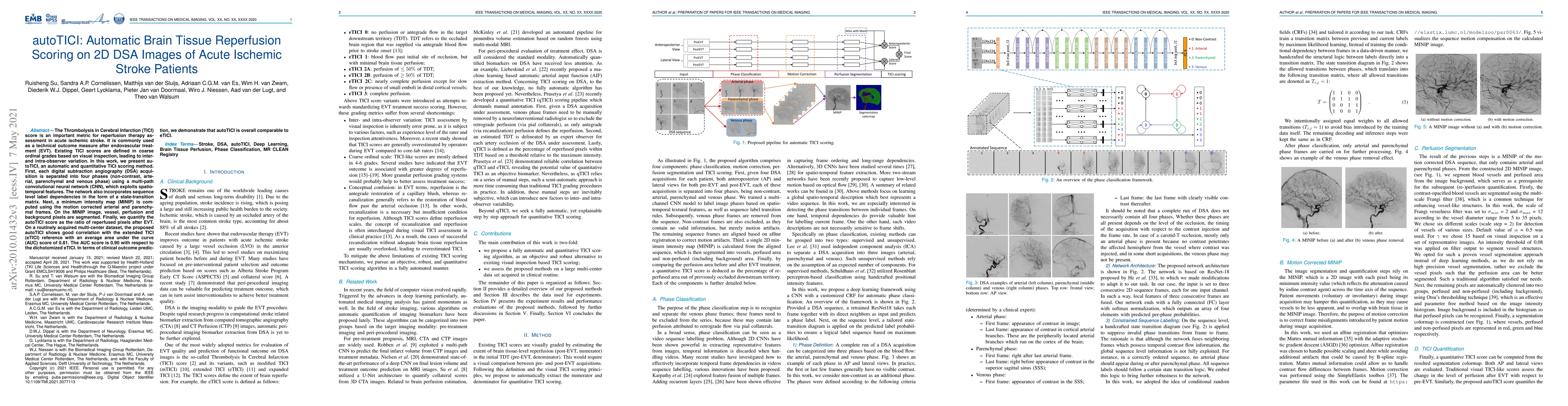 The Thrombolysis in Cerebral Infarction (TICI) score is an important metric for reperfusion therapy assessment in acute ischemic stroke. It is commonly used as a technical outcome measure after endovascular treatment (EVT). Existing TICI scores are defined in coarse ordinal grades based on visual inspection, leading to inter- and intra-observer variation. In this work, we present autoTICI, an automatic and quantitative TICI scoring method. First, each digital subtraction angiography (DSA) acquisition is separated into four phases (non-contrast, arterial, parenchymal and venous phase) using a multi-path convolutional neural network (CNN), which exploits spatio-temporal features. The network also incorporates sequence level label dependencies in the form of a state-transition matrix. Next, a minimum intensity map (MINIP) is computed using the motion corrected arterial and parenchymal frames. On the MINIP image, vessel, perfusion and background pixels are segmented. Finally, we quantify the autoTICI score as the ratio of reperfused pixels after EVT. On a routinely acquired multi-center dataset, the proposed autoTICI shows good correlation with the extended TICI (eTICI) reference with an average area under the curve (AUC) score of 0.81. The AUC score is 0.90 with respect to the dichotomized eTICI. In terms of clinical outcome prediction, we demonstrate that autoTICI is overall comparable to eTICI.
