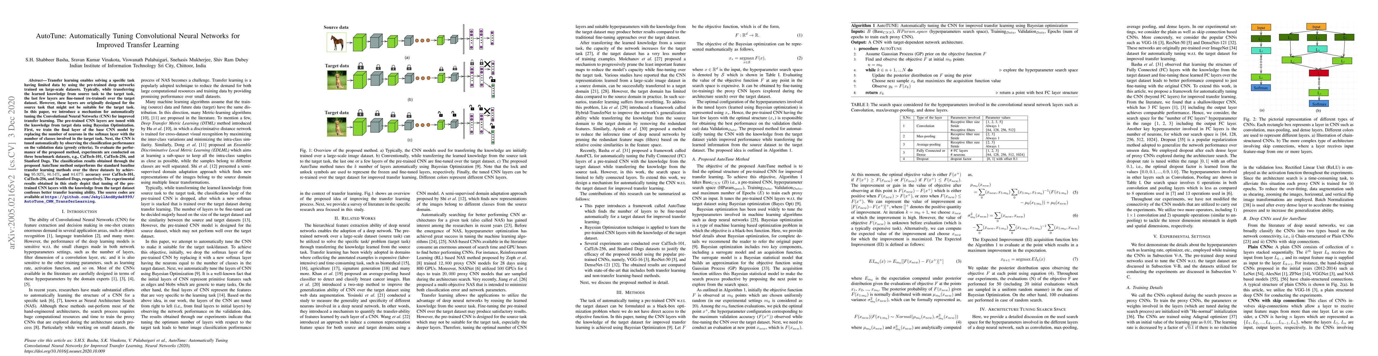 Transfer learning enables solving a specific task having limited data by using the pre-trained deep networks trained on large-scale datasets. Typically, while transferring the learned knowledge from source task to the target task, the last few layers are fine-tuned (re-trained) over the target dataset. However, these layers are originally designed for the source task that might not be suitable for the target task. In this paper, we introduce a mechanism for automatically tuning the Convolutional Neural Networks (CNN) for improved transfer learning. The pre-trained CNN layers are tuned with the knowledge from target data using Bayesian Optimization. First, we train the final layer of the base CNN model by replacing the number of neurons in the softmax layer with the number of classes involved in the target task. Next, the pre-trained CNN is tuned automatically by observing the classification performance on the validation data (greedy criteria). To evaluate the performance of the proposed method, experiments are conducted on three benchmark datasets, e.g., CalTech-101, CalTech-256, and Stanford Dogs. The classification results obtained through the proposed AutoTune method outperforms the standard baseline transfer learning methods over the three datasets by achieving $95.92\%$, $86.54\%$, and $84.67\%$ accuracy over CalTech-101, CalTech-256, and Stanford Dogs, respectively. The experimental results obtained in this study depict that tuning of the pre-trained CNN layers with the knowledge from the target dataset confesses better transfer learning ability. The source codes are available at https://github.com/JekyllAndHyde8999/AutoTune_CNN_TransferLearning.