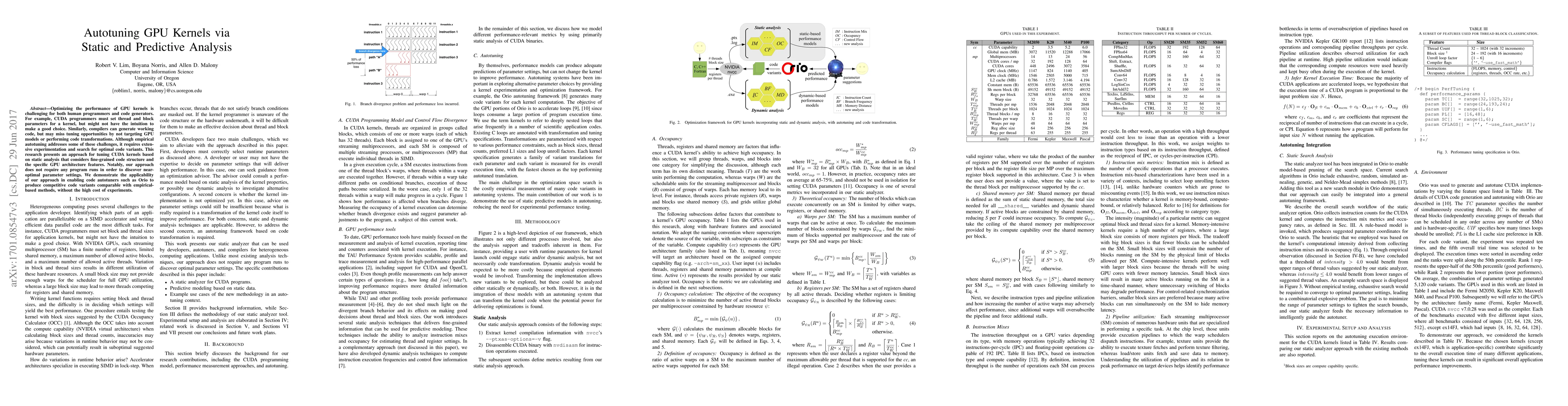 This paper proposes a static analysis-based approach for autotuning CUDA kernels that determines near-optimal thread and block parameters without requiring any program runs. The method leverages fine-grained code structure and GPU architecture features to outperform empirical autotuning, enabling code autotuners to generate competitive code variants efficiently.