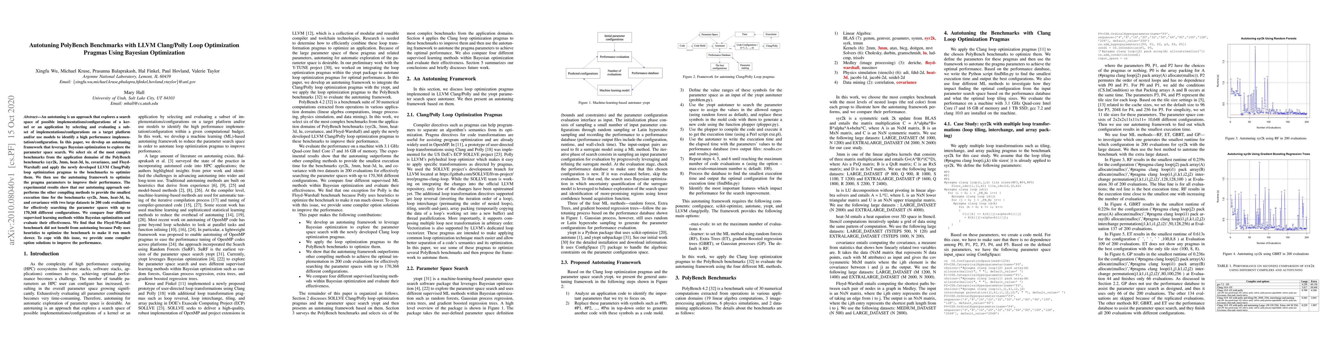 This paper presents an autotuning framework using Bayesian optimization to optimize LLVM Clang/Polly loop pragmas for six PolyBench benchmarks. The autotuning approach effectively reduces execution time for most benchmarks, but the Floyd-Warshall benchmark did not benefit due to Polly's heuristics, prompting the proposal of compiler options to improve performance.