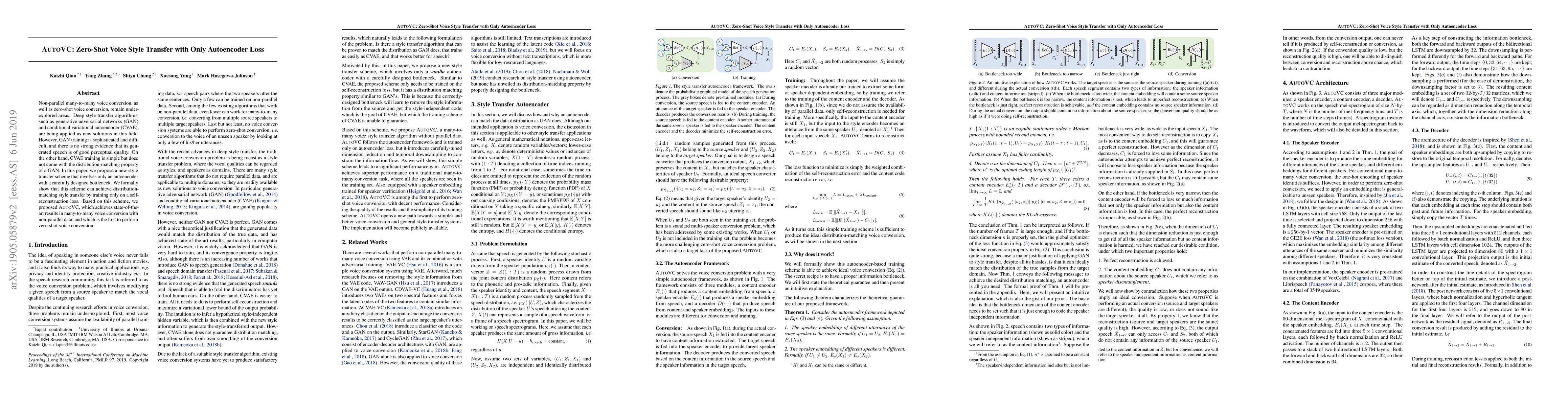 The paper introduces AUTOVC, a novel zero-shot voice style transfer method that leverages an autoencoder with a specially designed bottleneck for distribution-matching, achieving state-of-the-art results in many-to-many voice conversion without requiring parallel data. This approach eliminates the complexities and perceptual quality concerns associated with GANs and CVAEs.