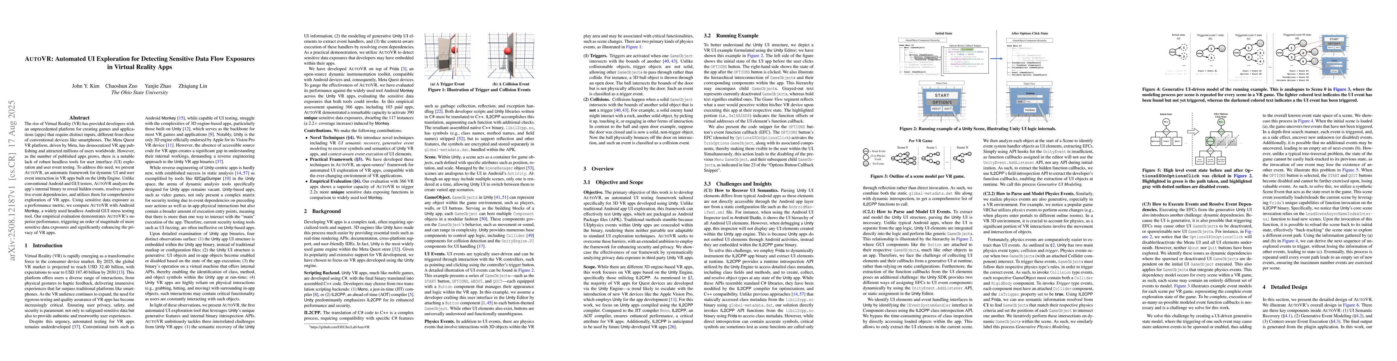The rise of Virtual Reality (VR) has provided developers with an unprecedented platform for creating games and applications (apps) that require distinct inputs, different from those of conventional devices like smartphones. The Meta Quest VR platform, driven by Meta, has democratized VR app publishing and attracted millions of users worldwide. However, as the number of published apps grows, there is a notable lack of robust headless tools for user interface (UI) exploration and user event testing. To address this need, we present AUTOVR, an automatic framework for dynamic UI and user event interaction in VR apps built on the Unity Engine. Unlike conventional Android and GUI testers, AUTOVR analyzes the app's internal binary to reveal hidden events, resolves generative event dependencies, and utilizes them for comprehensive exploration of VR apps. Using sensitive data exposure as a performance metric, we compare AUTOVR with Android Monkey, a widely used headless Android GUI stress testing tool. Our empirical evaluation demonstrates AUTOVR's superior performance, triggering an order of magnitude of more sensitive data exposures and significantly enhancing the privacy of VR apps.