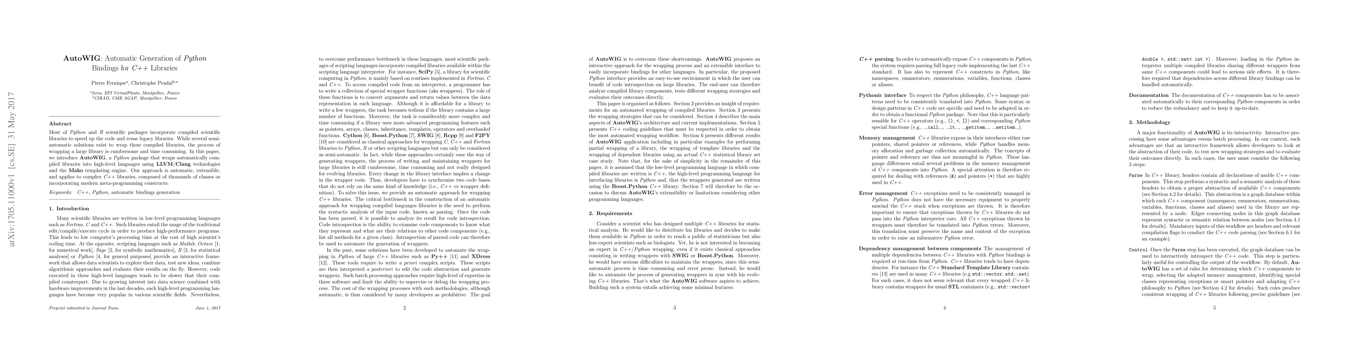 The paper introduces AutoWIG, a Python package that automatically generates Python bindings for C++ libraries using LLVM/Clang technologies and the Mako templating engine, targeting large and complex libraries.