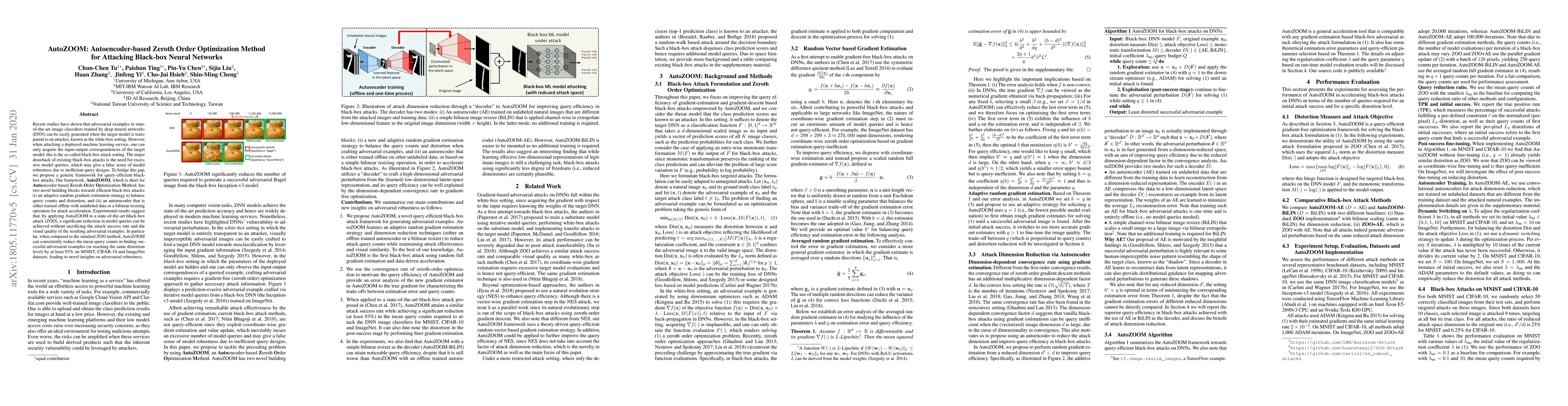 AutoZOOM proposes an efficient black-box attack framework for neural networks using adaptive gradient estimation and autoencoders to significantly reduce query counts while maintaining attack success rates and visual quality. Experimental results show a 93% reduction in mean query counts compared to standard methods on multiple datasets.