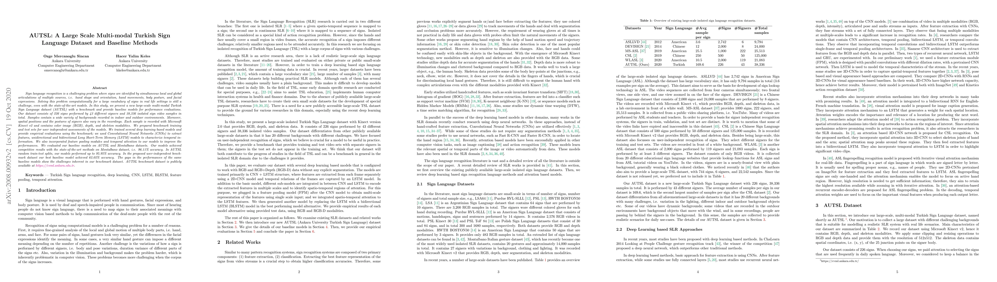 This paper introduces the AUTSL dataset, a large-scale multi-modal Turkish Sign Language dataset, and provides baseline models for sign language recognition. The dataset includes 226 signs from 43 signers, recorded with RGB, depth, and skeleton modalities, and is publicly available for performance evaluation. Baseline models achieved up to 95.95% accuracy on random splits but only 62.02% on the user-independent benchmark, highlighting the dataset's inherent challenges.