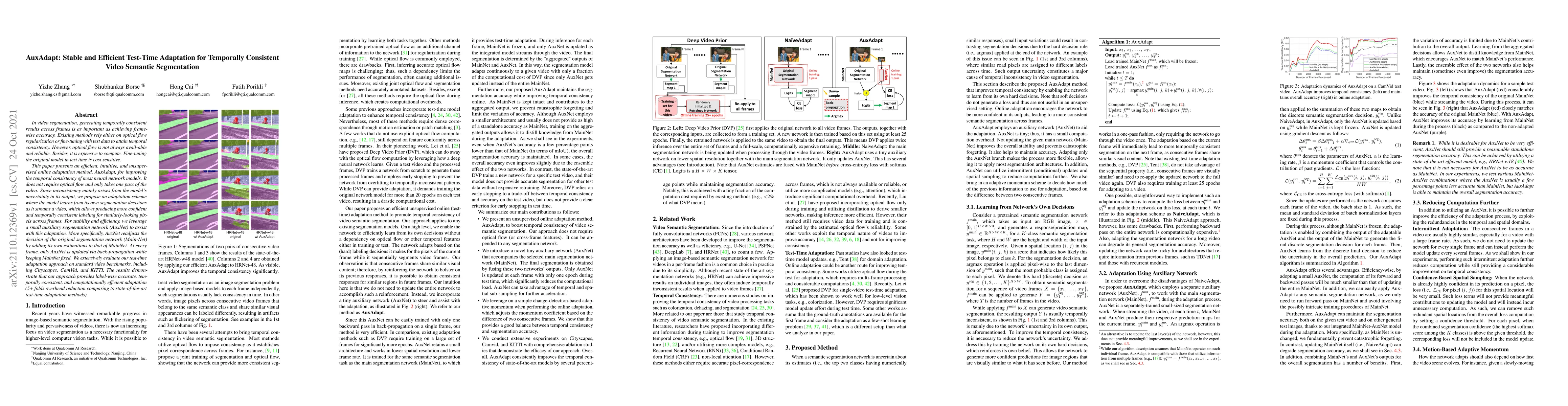 AuxAdapt introduces an efficient, unsupervised test-time adaptation method for temporally consistent video semantic segmentation, leveraging an auxiliary network to adjust the main segmentation model without requiring optical flow or fine-tuning. This approach significantly reduces computational overhead while maintaining high temporal consistency across video frames.