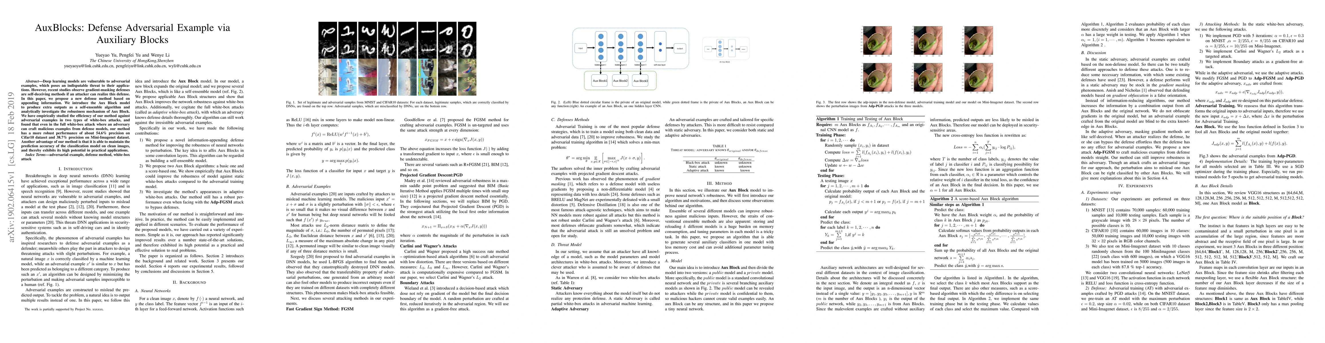 This paper introduces AuxBlocks, a defense method against adversarial examples in deep learning models. AuxBlocks appends auxiliary blocks to generate extra outputs, acting as a self-ensemble algorithm. It demonstrates robustness in white-box attacks, maintaining 54.6% precision on Cifar10 and 38.7% on Mini-Imagenet, while preserving classification accuracy on clean images.