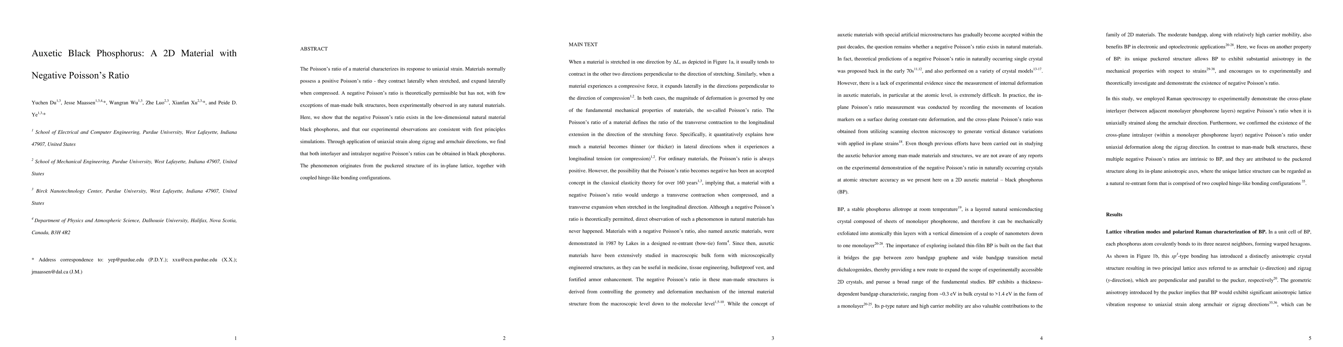 This study reveals that black phosphorus, a two-dimensional material, exhibits a rare negative Poisson's ratio, expanding laterally when stretched, due to its unique puckered lattice and hinge-like bonding configurations, confirmed by both experimental and simulation results.