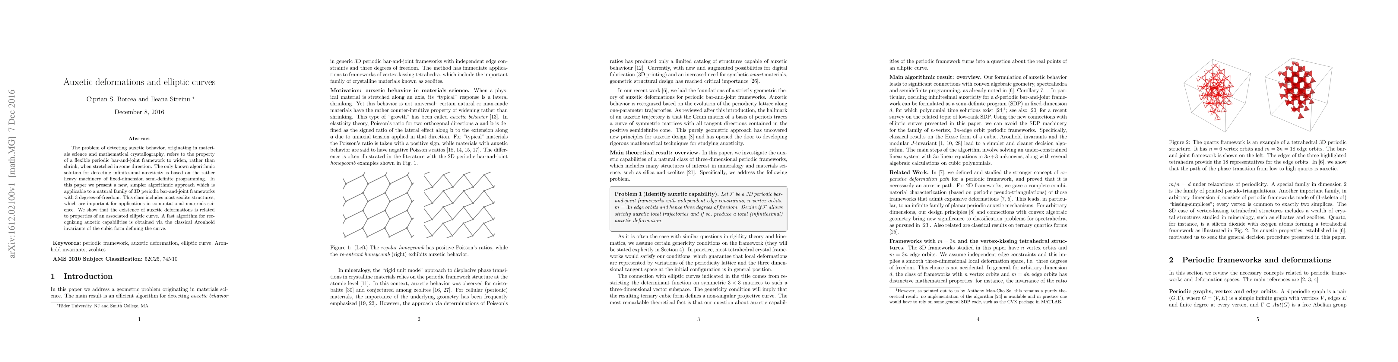 The problem of detecting auxetic behavior, originating in materials science and mathematical crystallography, refers to the property of a flexible periodic bar-and-joint framework to widen, rather than shrink, when stretched in some direction. The only known algorithmic solution for detecting infinitesimal auxeticity is based on the rather heavy machinery of fixed-dimension semi-definite programming. In this paper we present a new, simpler algorithmic approach which is applicable to a natural family of 3D periodic bar-and-joint frameworks with 3 degrees-of-freedom. This class includes most zeolite structures, which are important for applications in computational materials science. We show that the existence of auxetic deformations is related to properties of an associated elliptic curve. A fast algorithm for recognizing auxetic capabilities is obtained via the classical Aronhold invariants of the cubic form defining the curve.