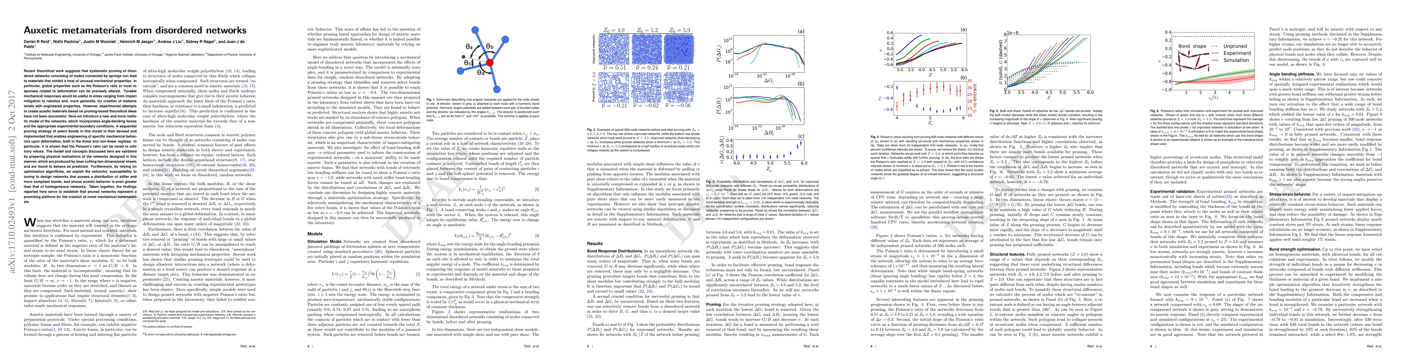 Recent theoretical work suggests that systematic pruning of disordered networks consisting of nodes connected by springs can lead to materials that exhibit a host of unusual mechanical properties. In particular, global properties such as the Poisson's ratio or local responses related to deformation can be precisely altered. Tunable mechanical responses would be useful in areas ranging from impact mitigation to robotics and, more generally, for creation of metamaterials with engineered properties. However, experimental attempts to create auxetic materials based on pruning-based theoretical ideas have not been successful. Here we introduce a new and more realistic model of the networks, which incorporates angle-bending forces and the appropriate experimental boundary conditions. A sequential pruning strategy of select bonds in this model is then devised and implemented that enables engineering of specific mechanical behaviors upon deformation, both in the linear and non-linear regimes. In particular, it is shown that the Poisson's ratio can be tuned to arbitrary values. The model and concepts discussed here are validated by preparing physical realizations of the networks designed in this manner, which are produced by laser cutting two-dimensional sheets and are found to behave as predicted. Furthermore, by relying on optimization algorithms, we exploit the networks' susceptibility to tuning to design networks that posses a distribution of stiffer and more compliant bonds, and whose auxetic behavior is even greater than that of homogeneous networks. Taken together, the findings reported here serve to establish that pruned networks represent a promising platform for the creation of novel mechanical metamaterials.