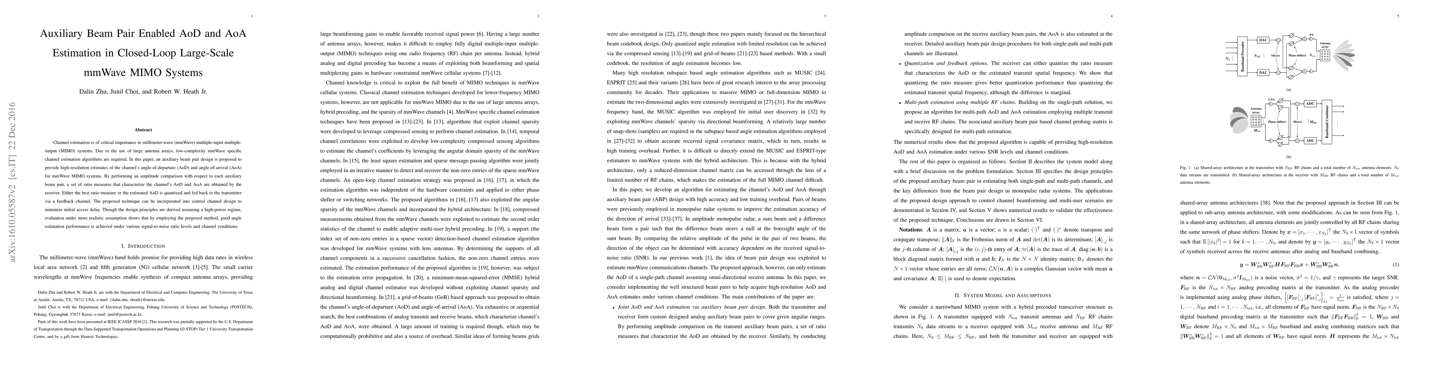 This paper proposes an auxiliary beam pair design for high-resolution angle-of-departure (AoD) and angle-of-arrival (AoA) estimation in large-scale mmWave MIMO systems, achieving good performance under various signal-to-noise ratios and channel conditions. The method minimizes initial access delay by incorporating the technique into control channel design.