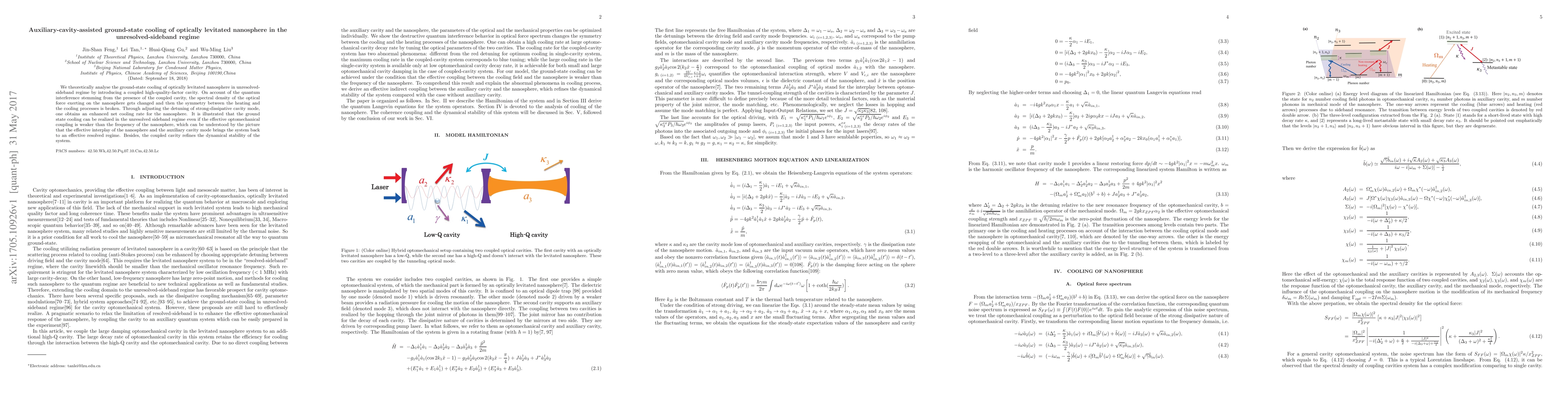 This paper theoretically explores ground-state cooling of an optically levitated nanosphere using an auxiliary high-quality-factor cavity in the unresolved-sideband regime. The coupled cavity enhances the net cooling rate by breaking the symmetry between heating and cooling processes, achieving ground-state cooling even with weaker optomechanical coupling.