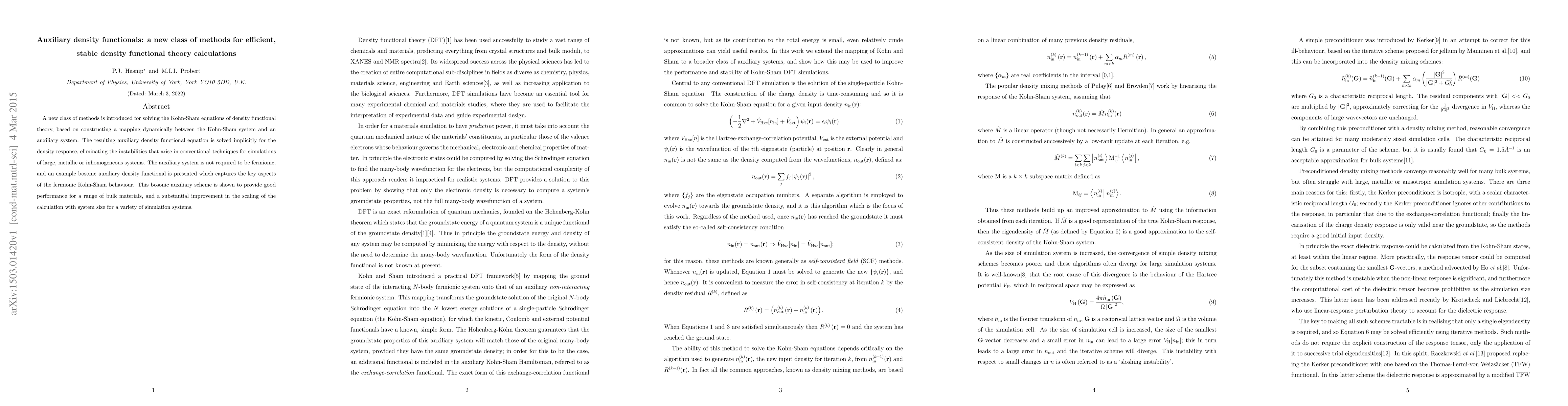 A new class of methods is introduced for solving the Kohn-Sham equations of density functional theory, based on constructing a mapping dynamically between the Kohn-Sham system and an auxiliary system. The resulting auxiliary density functional equation is solved implicitly for the density response, eliminating the instabilities that arise in conventional techniques for simulations of large, metallic or inhomogeneous systems. The auxiliary system is not required to be fermionic, and an example bosonic auxiliary density functional is presented which captures the key aspects of the fermionic Kohn-Sham behaviour. This bosonic auxiliary scheme is shown to provide good performance for a range of bulk materials, and a substantial improvement in the scaling of the calculation with system size for a variety of simulation systems.