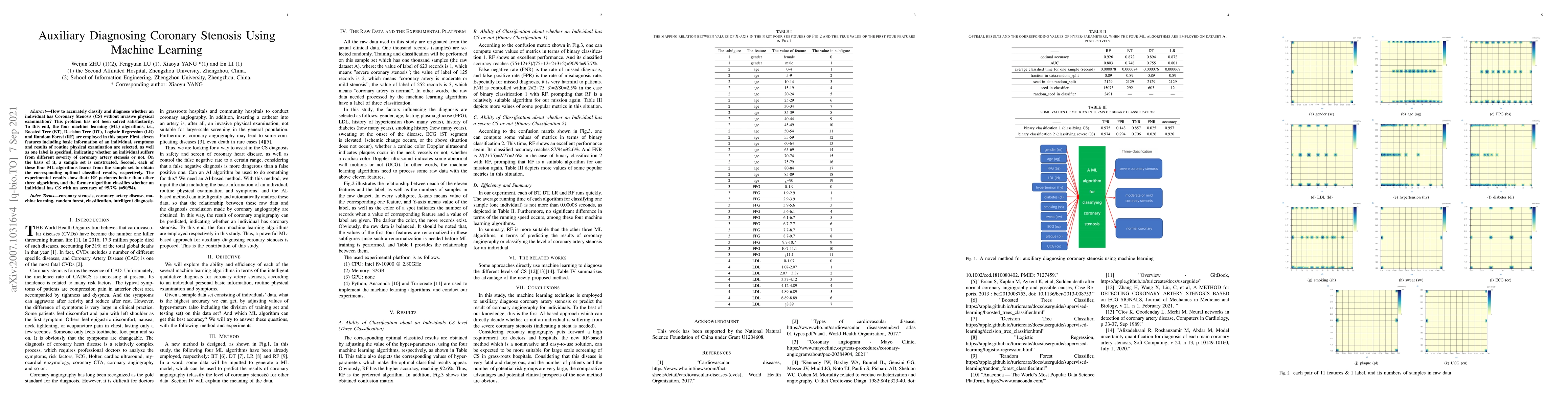 This research paper uses machine learning algorithms to diagnose coronary stenosis without invasive physical examination, achieving an accuracy of 95.7% with the Random Forest algorithm.