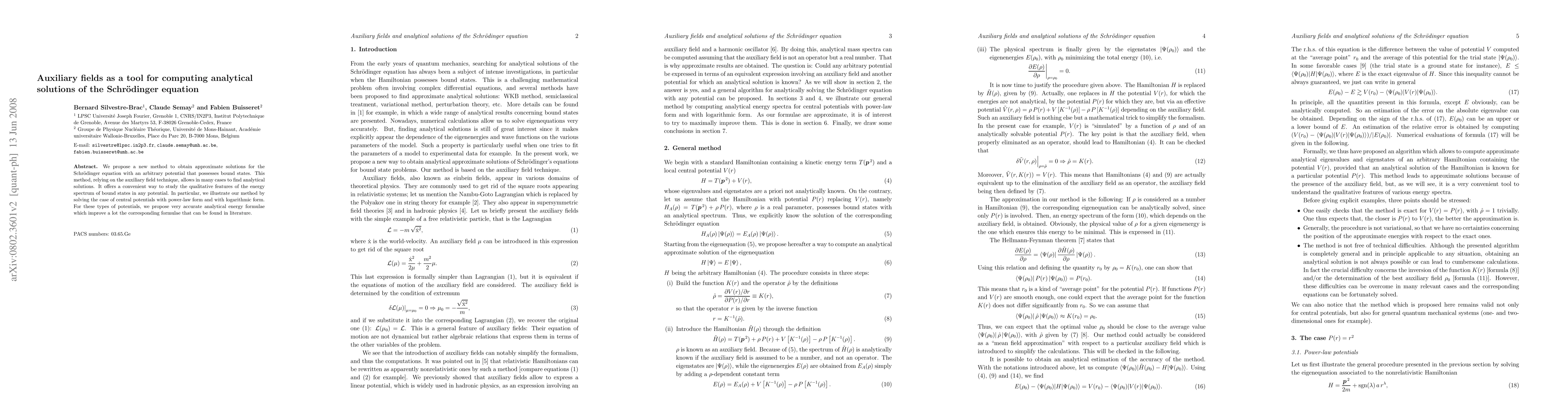 This paper introduces a new auxiliary field technique to derive approximate analytical solutions for the Schrödinger equation with arbitrary bound-state potentials, offering improved analytical energy formulae for central potentials, particularly those with power-law and logarithmic forms. The method provides a convenient means to study the qualitative features of bound state energy spectra.