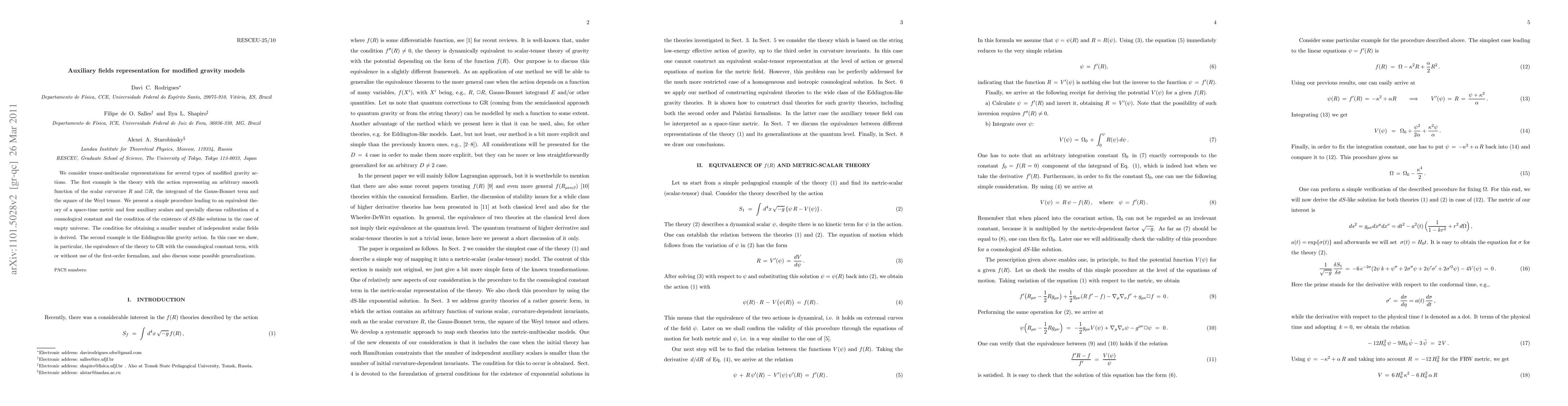 We consider tensor-multiscalar representations for several types of modified gravity actions. The first example is the theory with the action representing an arbitrary smooth function of the scalar curvature R and (Box R), the integrand of the Gauss-Bonnet term and the square of the Weyl tensor. We present a simple procedure leading to an equivalent theory of a space-time metric and four auxiliary scalars and specially discuss calibration of a cosmological constant and the condition of the existence of dS-like solutions in the case of empty universe. The condition for obtaining a smaller number of independent scalar fields is derived. The second example is the Eddington-like gravity action. In this case we show, in particular, the equivalence of the theory to GR with the cosmological constant term, with or without use of the first-order formalism, and also discuss some possible generalizations.