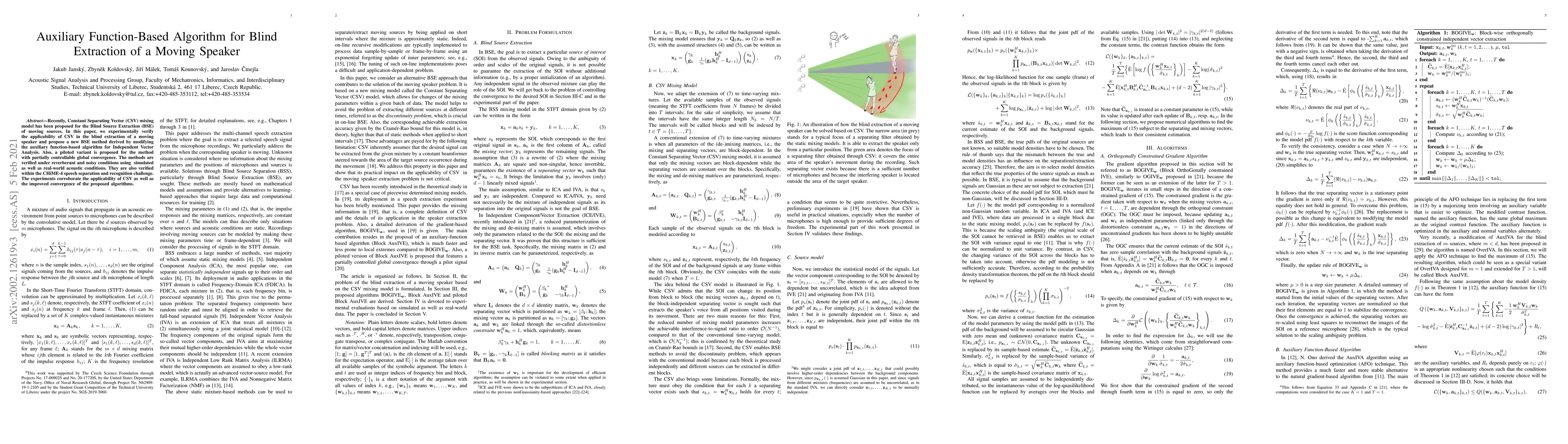 This paper verifies the use of Constant Separating Vector (CSV) for blind extraction of a moving speaker, proposing a new algorithm based on auxiliary function-independent vector analysis. It introduces a piloted variant for partially controllable global convergence, successfully tested under reverberant and noisy conditions, including real-world scenarios and the CHiME-4 challenge, confirming CSV's applicability and improved algorithm convergence.