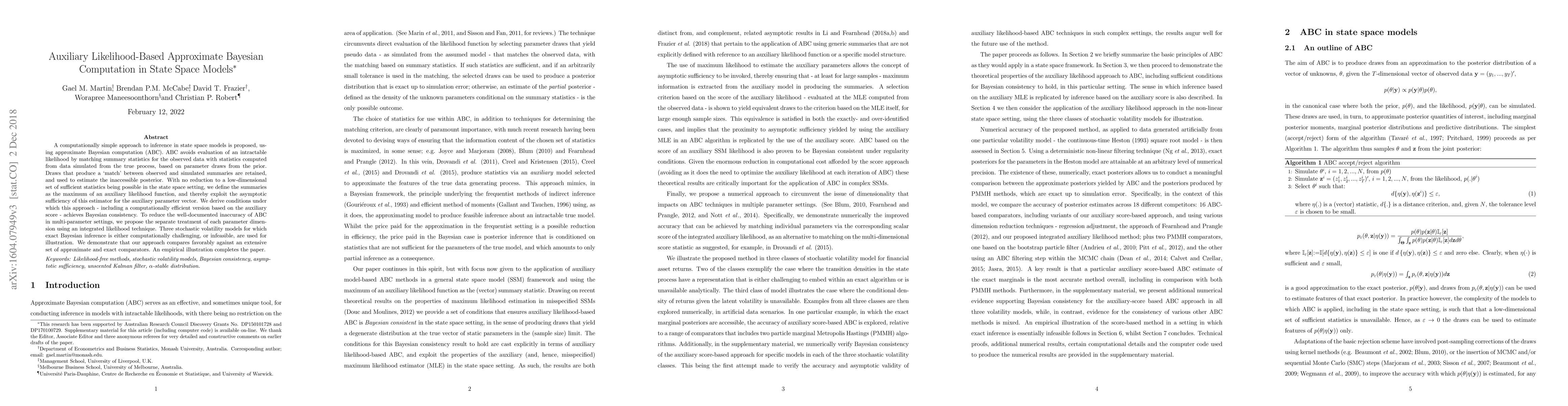 This paper proposes a computationally simple approximate Bayesian computation (ABC) method for state space models, using auxiliary likelihood-based summaries to achieve Bayesian consistency without reducing to sufficient statistics. It also addresses multi-parameter inaccuracies by treating each parameter dimension separately, demonstrating effectiveness through stochastic volatility models.