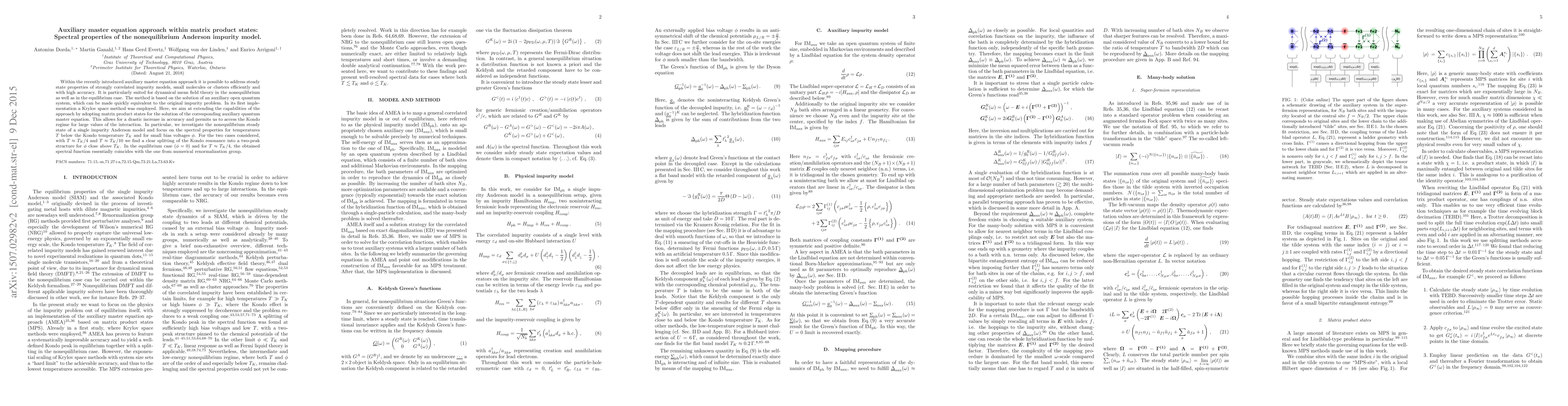 This paper introduces an auxiliary master equation approach utilizing matrix product states to study the spectral properties of the nonequilibrium Anderson impurity model. The method provides improved accuracy and enables investigation of the Kondo regime, revealing a two-peak structure in the spectral function below the Kondo temperature for small bias voltages.