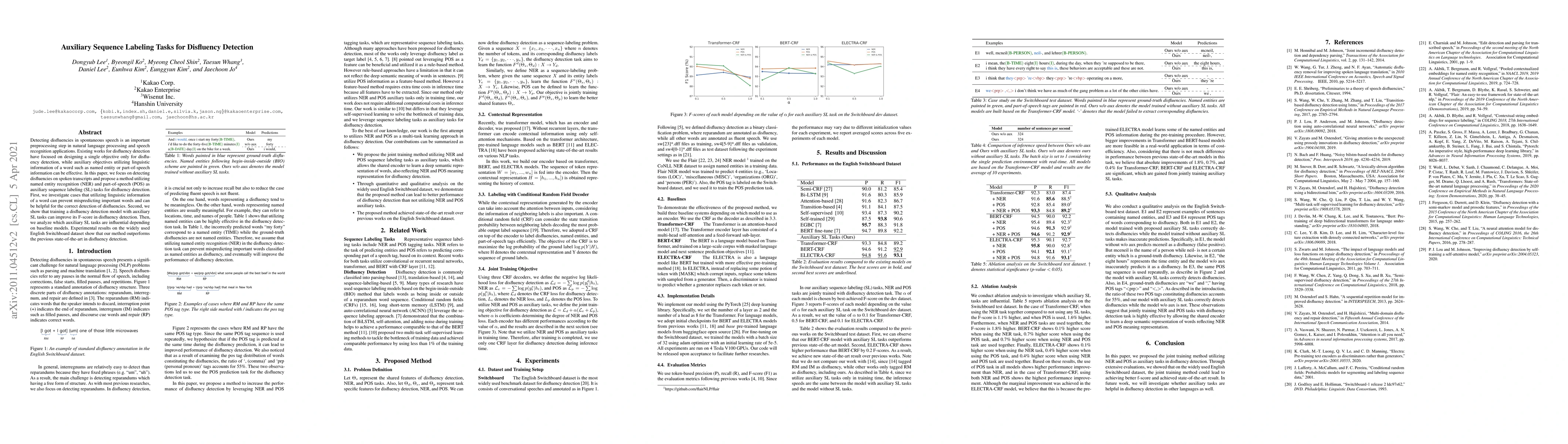 This paper proposes a method for disfluency detection in spoken transcripts by incorporating auxiliary sequence labeling tasks, specifically named entity recognition (NER) and part-of-speech (POS) tagging, to improve detection accuracy. Experimental results on the Switchboard dataset demonstrate that this approach outperforms previous state-of-the-art methods.