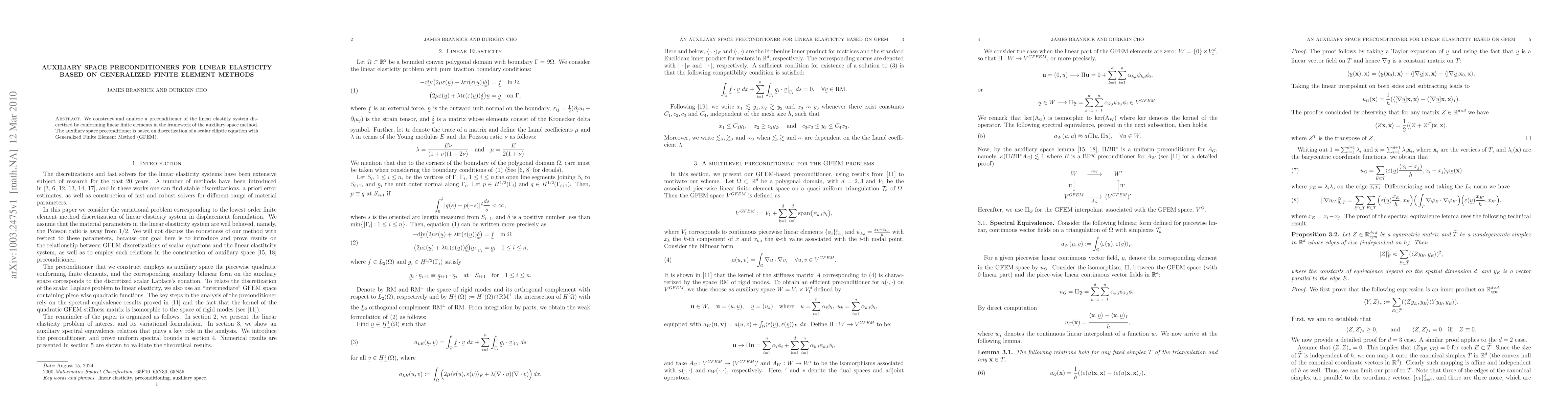 Summary: This paper constructs and analyzes an auxiliary space preconditioner for linear elasticity systems discretized using conforming linear finite elements, employing the Generalized Finite Element Method to discretize a scalar elliptic equation for improved computational efficiency.