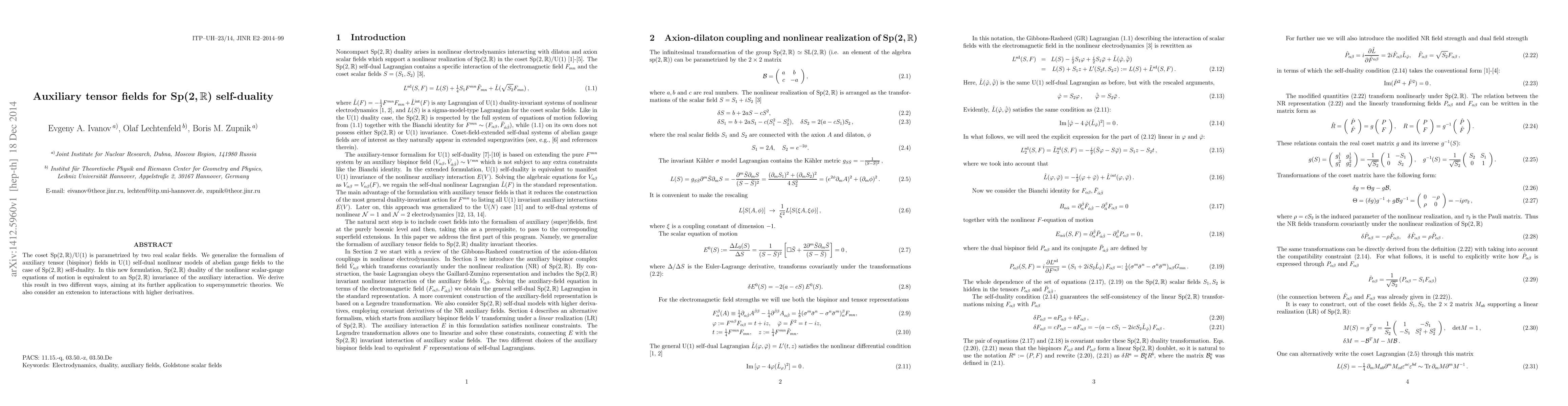 This paper generalizes the formalism of auxiliary tensor fields from U(1) self-dual models to Sp(2,R) self-duality, establishing an equivalence between Sp(2,R) invariance and duality in nonlinear scalar-gauge equations. The authors aim to extend these results for application in supersymmetric theories and discuss higher derivative interactions.