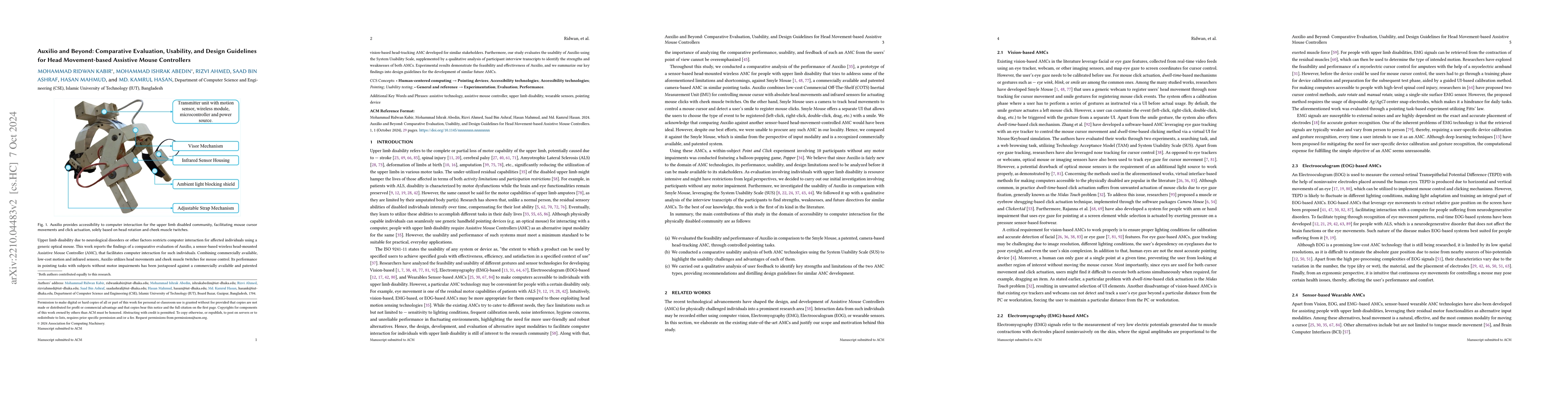 Auxilio is a sensor-based wireless head-mounted mouse prototype designed to assist individuals with upper limb disabilities in computer interaction. The prototype uses low-cost motion and infrared sensors to track head and cheek movements, and its performance is compared to a generic optical mouse in various tasks.