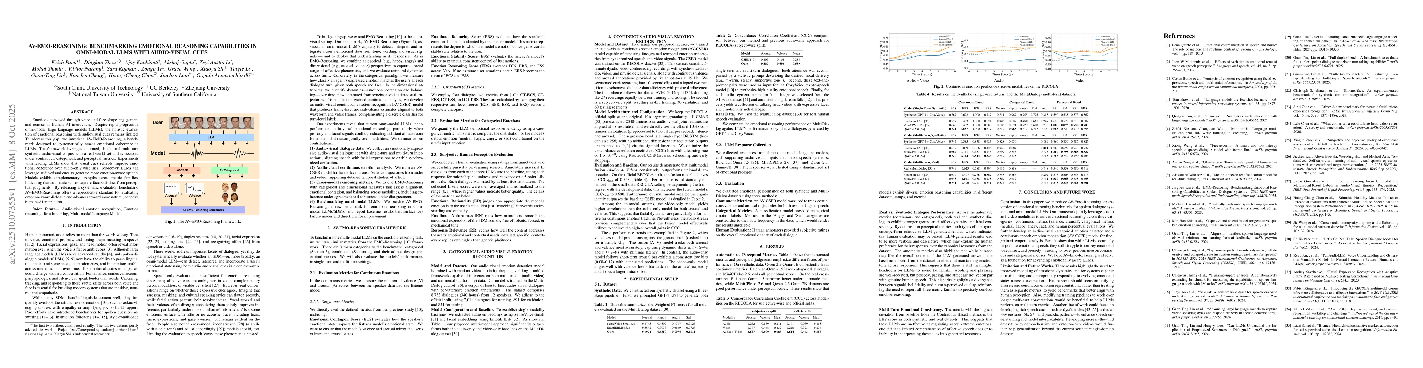 Emotions conveyed through voice and face shape engagement and context in human-AI interaction. Despite rapid progress in omni-modal large language models (LLMs), the holistic evaluation of emotional reasoning with audiovisual cues remains limited. To address this gap, we introduce AV-EMO-Reasoning, a benchmark designed to systematically assess emotional coherence in LLMs. The framework leverages a curated, single- and multi-turn synthetic audiovisual corpus with a real-world set and is assessed under continuous, categorical, and perceptual metrics. Experiments with leading LLMs show that visual cues reliably improve emotional coherence over audio-only baselines. Moreover, LLMs can leverage audio-visual cues to generate more emotion-aware speech. Models exhibit complementary strengths across metric families, indicating that automatic scores capture facets distinct from perceptual judgments. By releasing a systematic evaluation benchmark, AV-EMO-Reasoning offers a reproducible standard for evaluating emotion-aware dialogue and advances toward more natural, adaptive human-AI interaction.