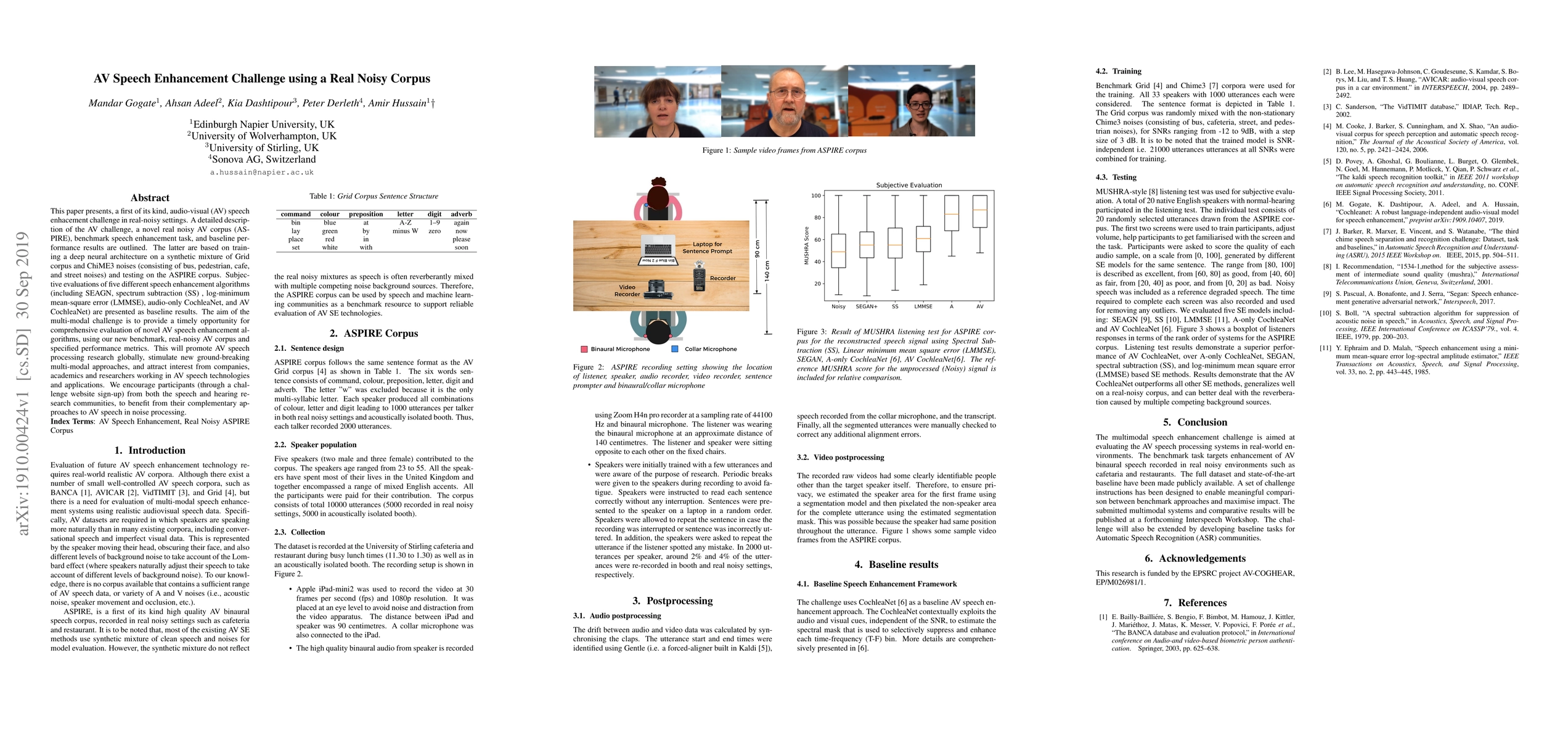 This paper introduces an audio-visual (AV) speech enhancement challenge using a novel real-noisy corpus, ASPIRE, to benchmark and evaluate various speech enhancement algorithms. Baseline results from multiple algorithms highlight the challenge's potential to stimulate new AV speech processing research and attract global interest from both academic and industry sectors.