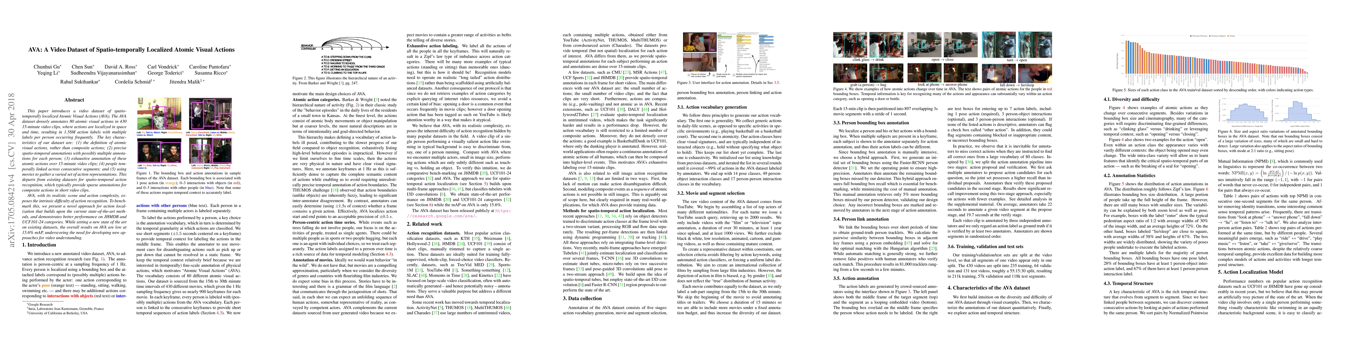 This paper introduces a video dataset of spatio-temporally localized Atomic Visual Actions (AVA). The AVA dataset densely annotates 80 atomic visual actions in 430 15-minute video clips, where actions are localized in space and time, resulting in 1.58M action labels with multiple labels per person occurring frequently. The key characteristics of our dataset are: (1) the definition of atomic visual actions, rather than composite actions; (2) precise spatio-temporal annotations with possibly multiple annotations for each person; (3) exhaustive annotation of these atomic actions over 15-minute video clips; (4) people temporally linked across consecutive segments; and (5) using movies to gather a varied set of action representations. This departs from existing datasets for spatio-temporal action recognition, which typically provide sparse annotations for composite actions in short video clips. We will release the dataset publicly. AVA, with its realistic scene and action complexity, exposes the intrinsic difficulty of action recognition. To benchmark this, we present a novel approach for action localization that builds upon the current state-of-the-art methods, and demonstrates better performance on JHMDB and UCF101-24 categories. While setting a new state of the art on existing datasets, the overall results on AVA are low at 15.6% mAP, underscoring the need for developing new approaches for video understanding.