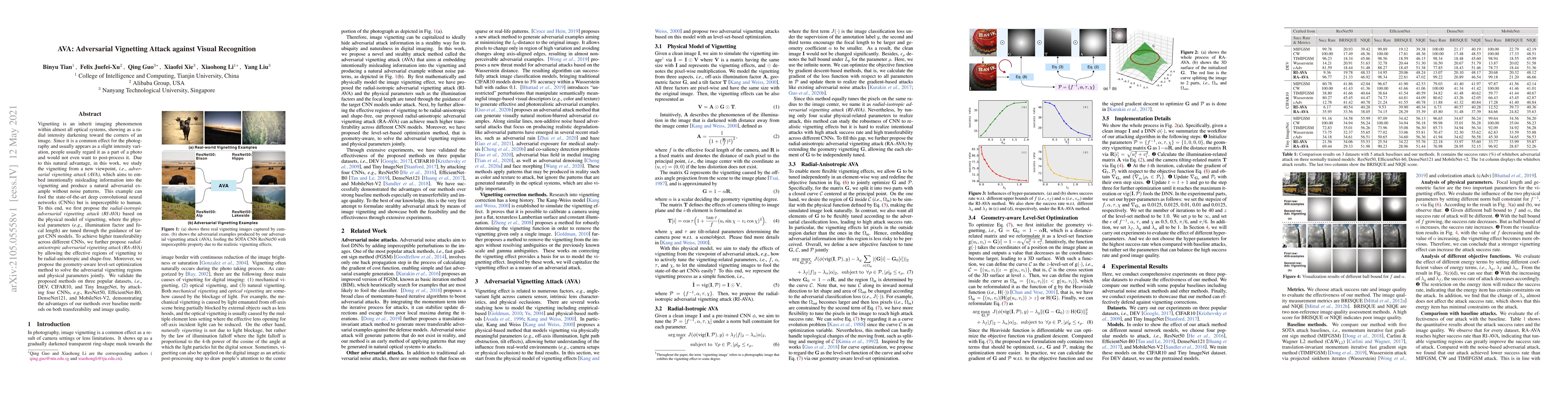 This paper introduces adversarial vignetting attacks (AVA) to embed misleading information into vignetting, fooling advanced CNNs while remaining imperceptible to humans. The proposed RI-AVA and RA-AVA methods enhance transferability across different CNNs and are validated on multiple datasets and models, showing superior performance over baselines.