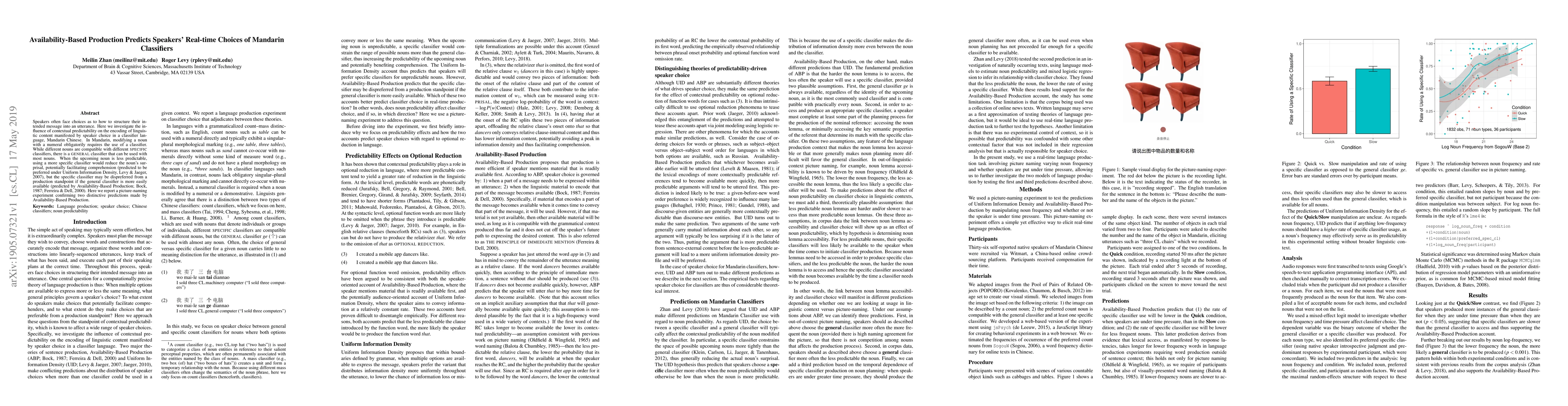 Speakers often face choices as to how to structure their intended message into an utterance. Here we investigate the influence of contextual predictability on the encoding of linguistic content manifested by speaker choice in a classifier language. In English, a numeral modifies a noun directly (e.g., three computers). In classifier languages such as Mandarin Chinese, it is obligatory to use a classifier (CL) with the numeral and the noun (e.g., three CL.machinery computer, three CL.general computer). While different nouns are compatible with different specific classifiers, there is a general classifier "ge" (CL.general) that can be used with most nouns. When the upcoming noun is less predictable, the use of a more specific classifier would reduce surprisal at the noun thus potentially facilitate comprehension (predicted by Uniform Information Density, Levy & Jaeger, 2007), but the use of that more specific classifier may be dispreferred from a production standpoint if accessing the general classifier is always available (predicted by Availability-Based Production; Bock, 1987; Ferreira & Dell, 2000). Here we use a picture-naming experiment showing that Availability-Based Production predicts speakers' real-time choices of Mandarin classifiers.